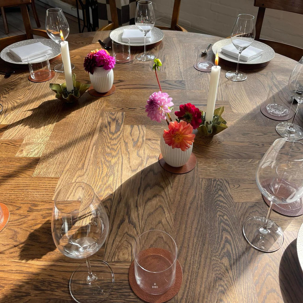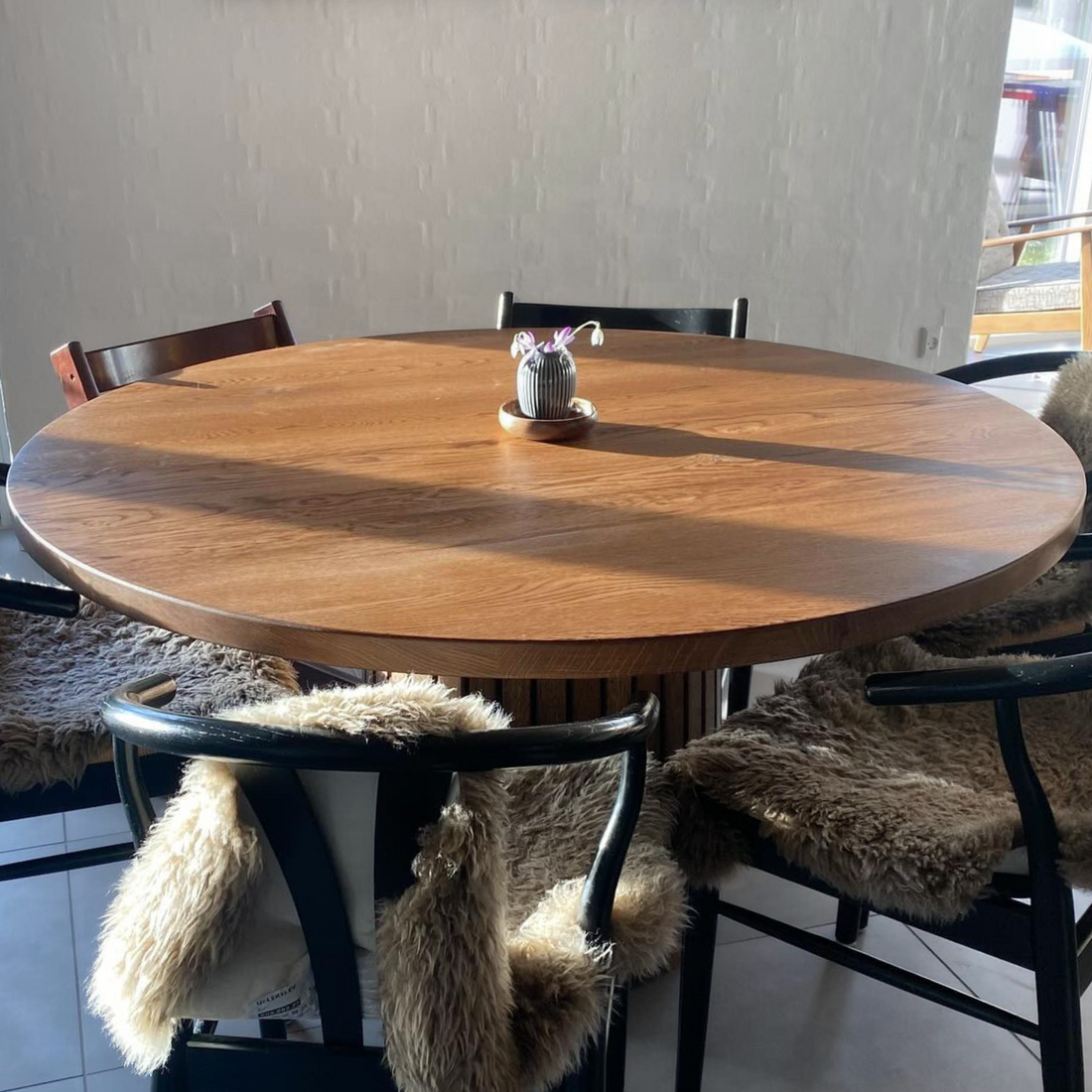 Rundt plankebord m. eg sokkelfod + (0-2 tillægsplader)
