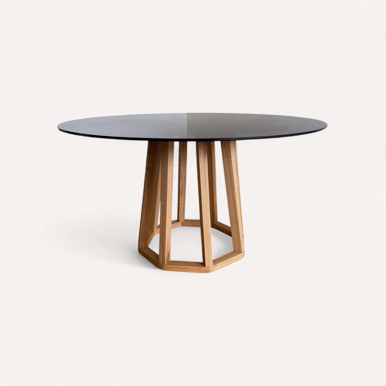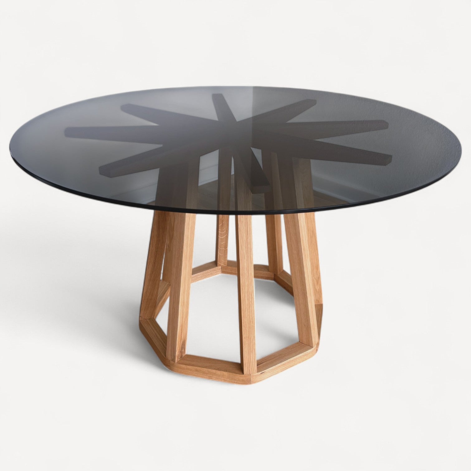 Dette glasbord kombinerer et markant arkitektonisk udtryk med solidt snedkerhåndværk. Stellet er konstrueret i massivt egetræ og opbygget med en ottekantet base, som sikrer maksimal stabilitet og skaber en visuel lethed trods det robuste materialevalg. Øverst binder stjernestellet designet sammen og løfter glaspladen, så den svæver elegant over det geometriske fundament.