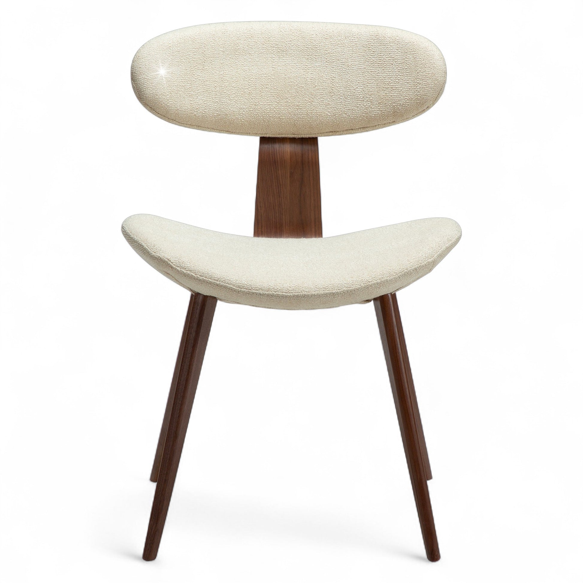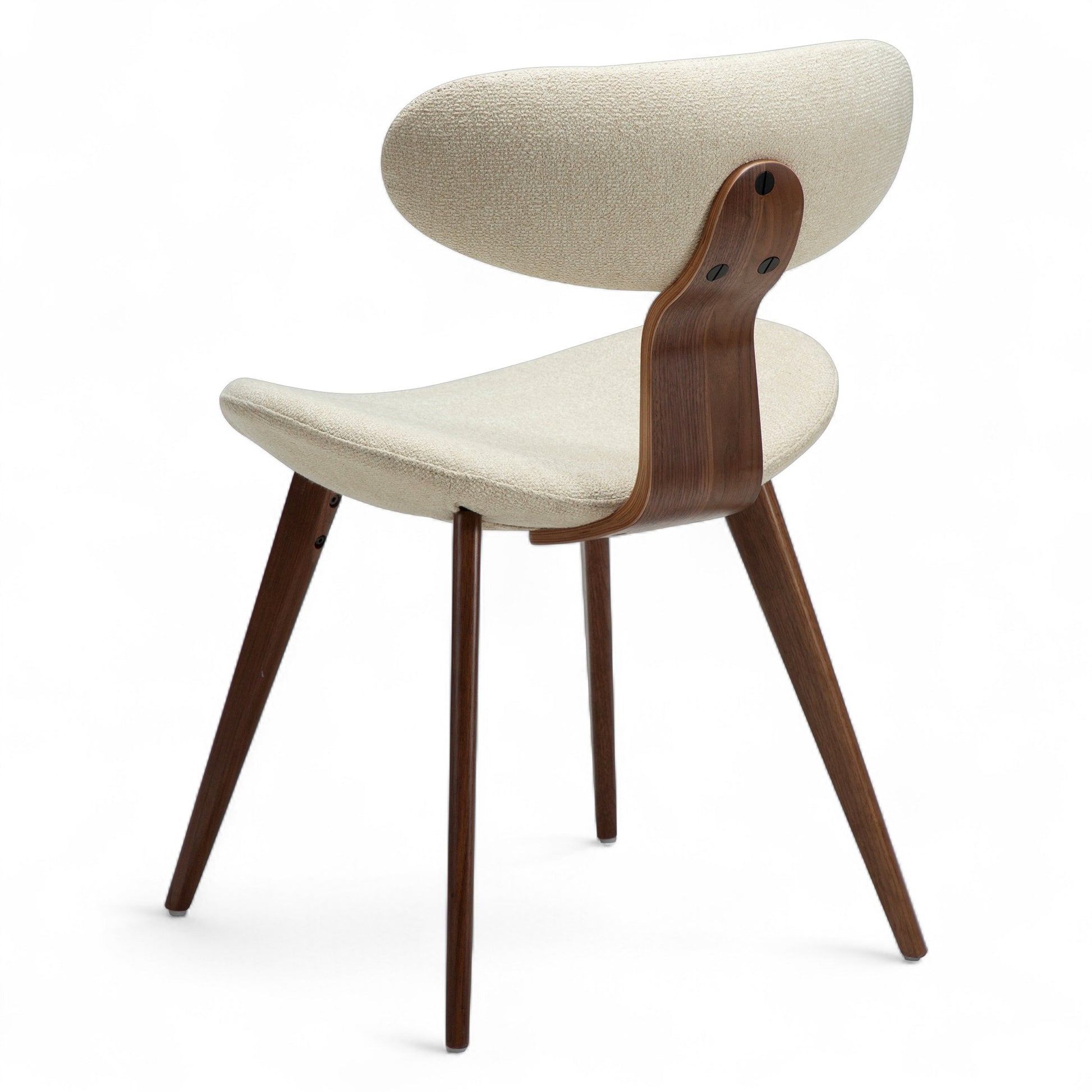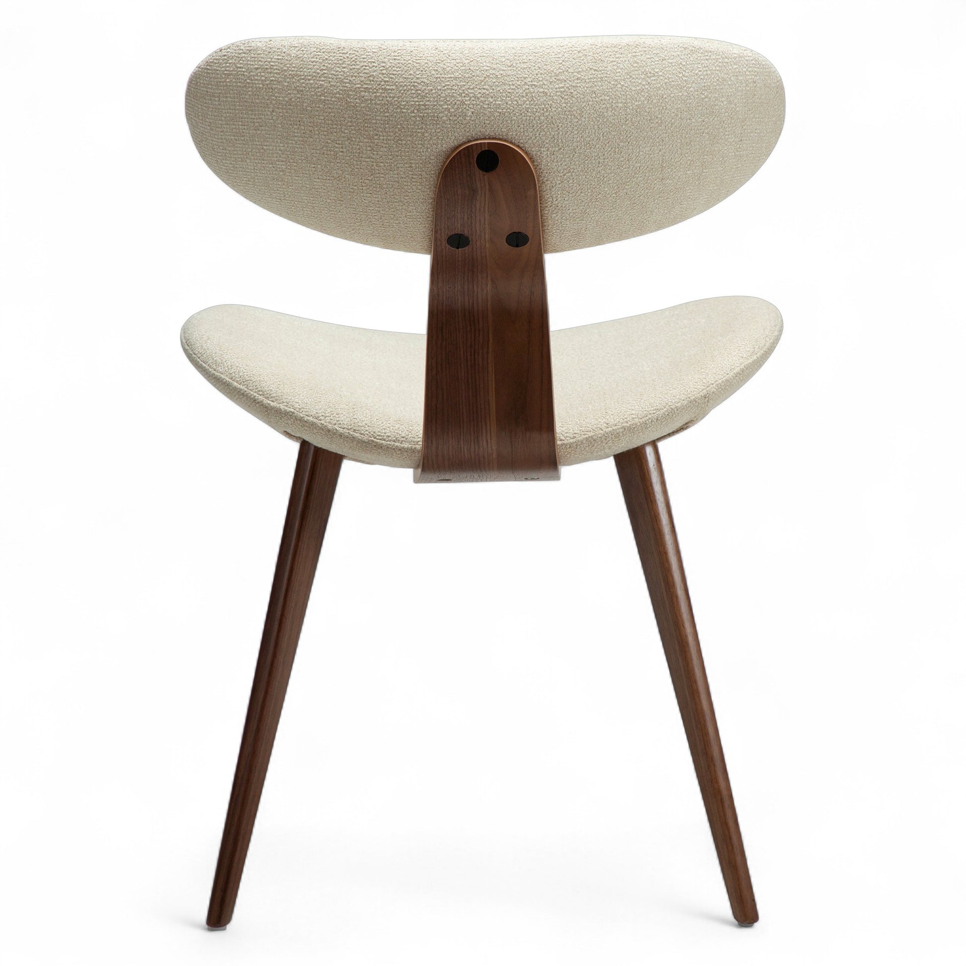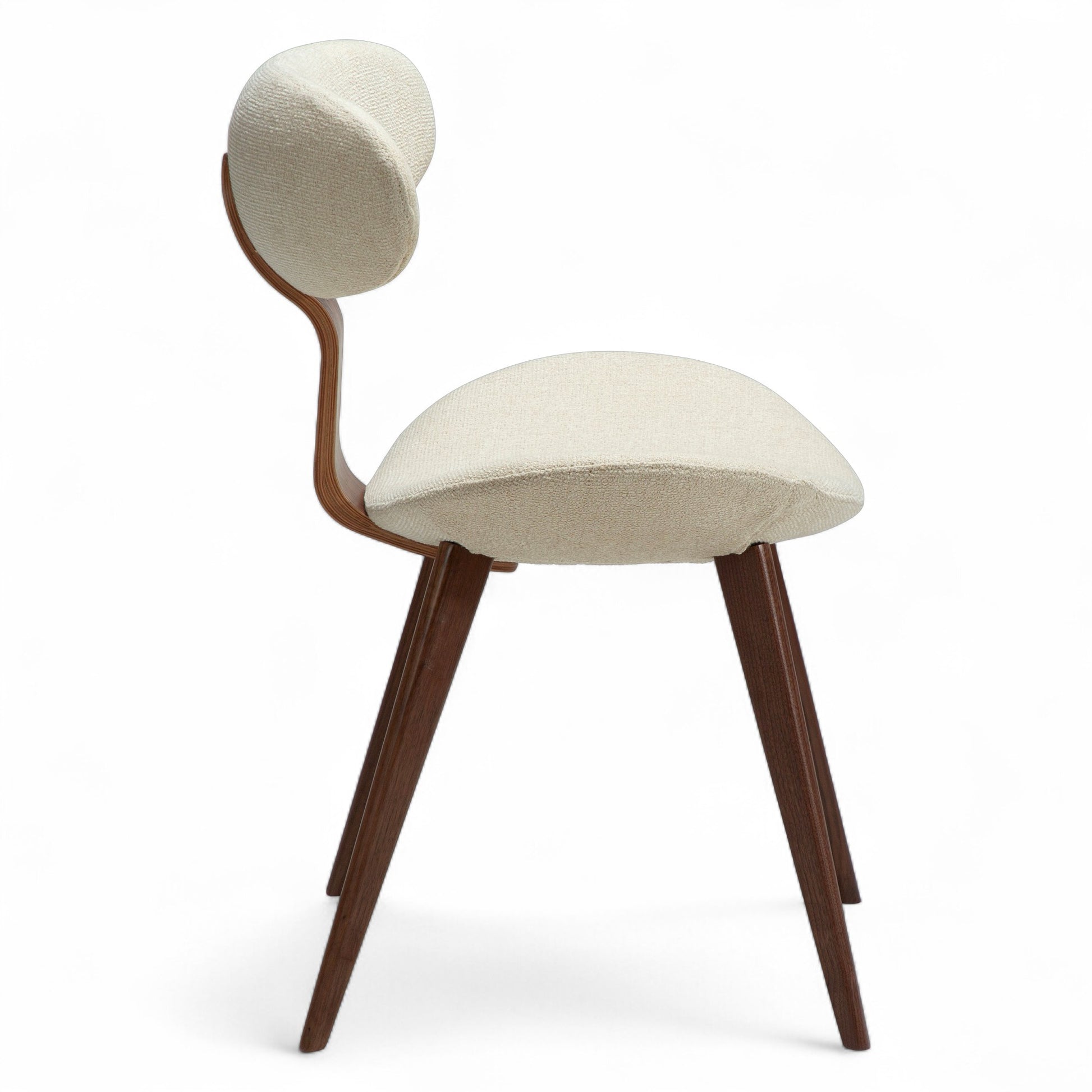 BUCKLE-stolen er et moderne bud på nordisk møbeldesign, hvor kurvede linjer og naturlige materialer mødes i et elegant og nytænkende formsprog. Ryggens bølgende træelement i formpresset finer skaber en let og svævende æstetik, mens det polstrede sæde og ryglæn i blød bouclé-tekstil tilfører både komfort og taktil varme.