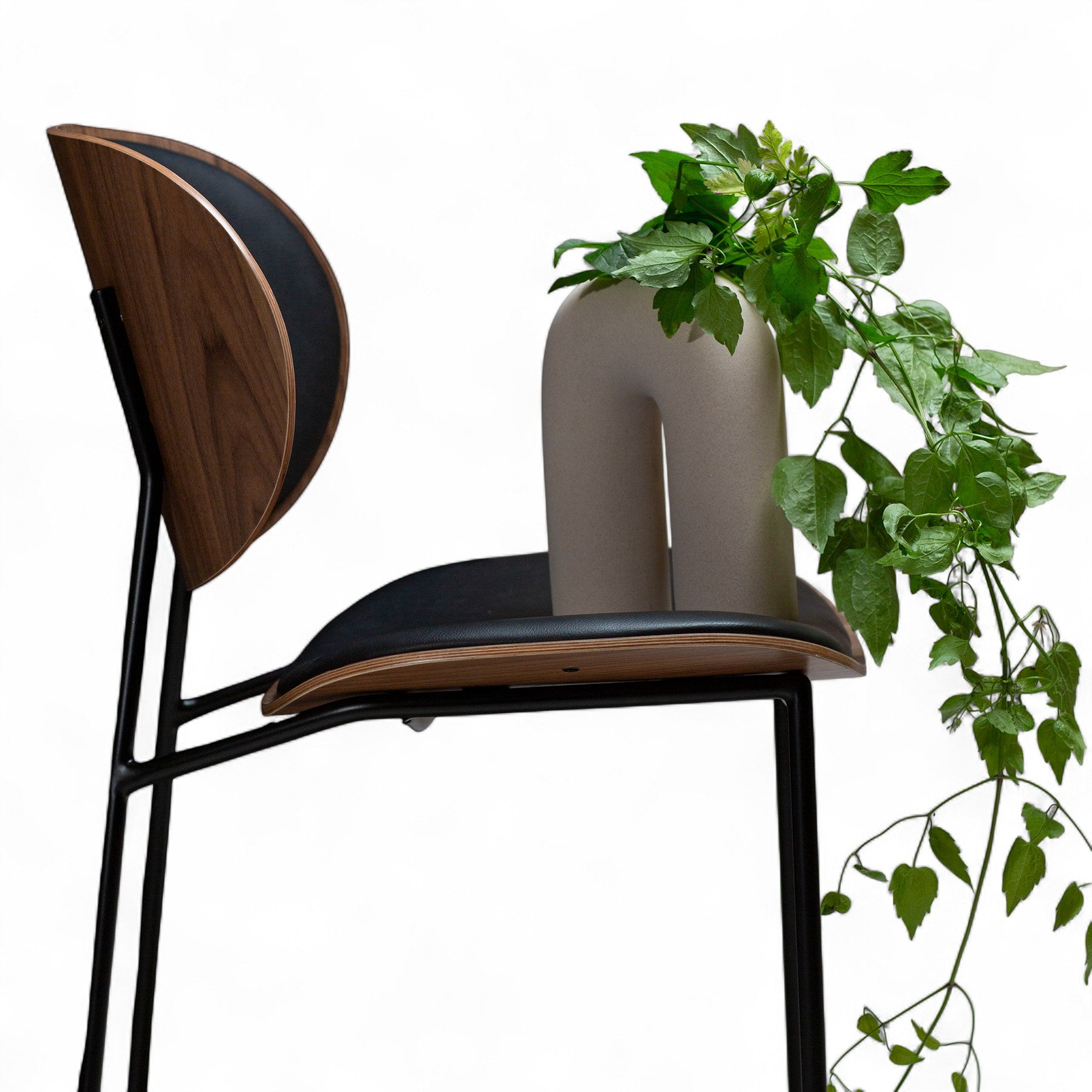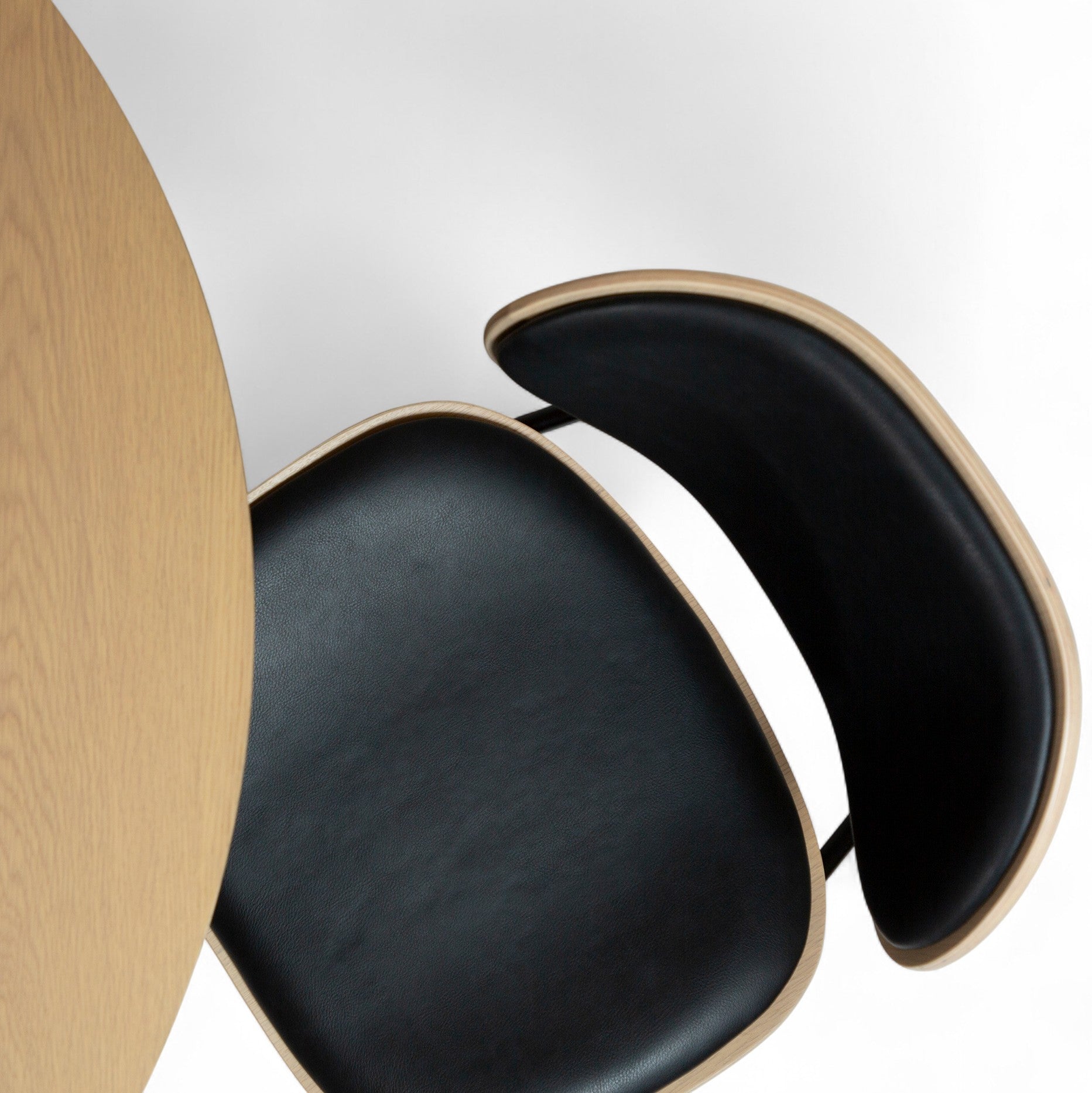 BUCKLE-stolen er et moderne bud på nordisk møbeldesign, hvor kurvede linjer og naturlige materialer mødes i et elegant og nytænkende formsprog. Ryggens bølgende træelement i formpresset finer skaber en let og svævende æstetik, mens det polstrede sæde og ryglæn i blød bouclé-tekstil tilfører både komfort og taktil varme.