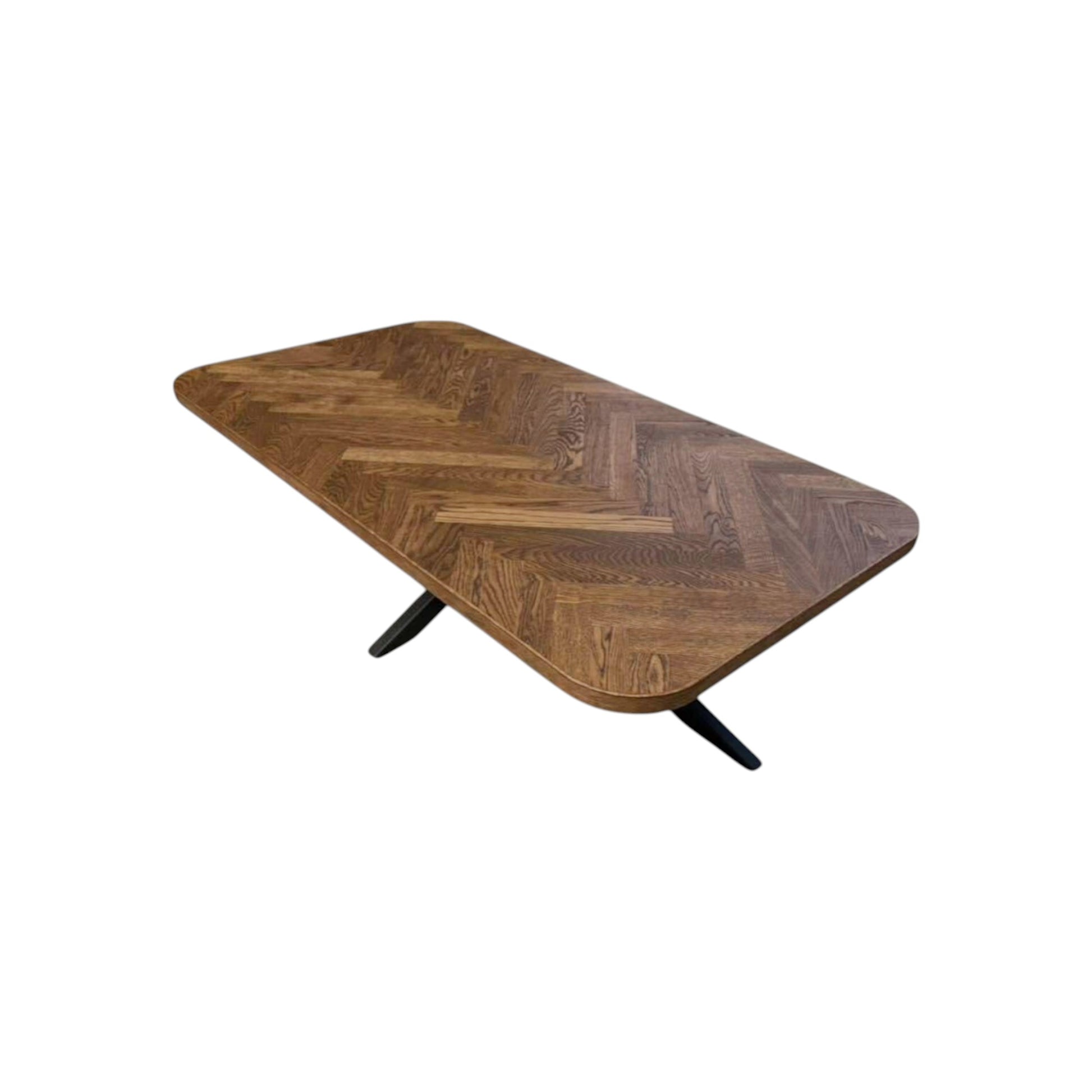 Dette sofabord er fremstillet i massivt egetræ og prydet med et klassisk sildebensmønster, der skaber dybde og liv i overfladen. De afrundede hjørner og de bløde linjer giver bordet et harmonisk udtryk, der bringer varme og balance ind i stuen.