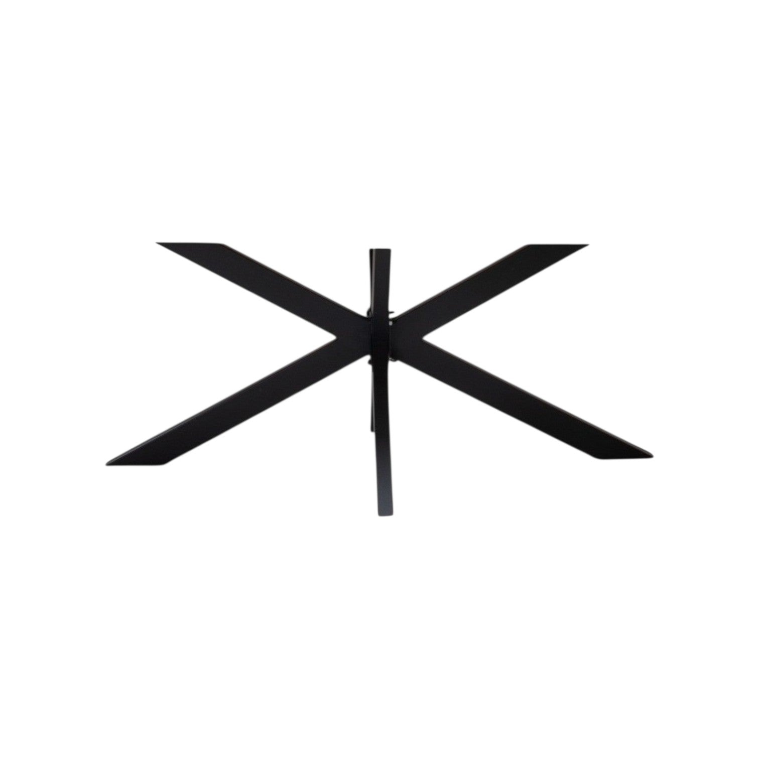 Som standard bæres bordpladen af et skulpturelt stjernestel i sort pulverlakeret stål. Stellet giver bordet stabilitet og et moderne præg, der står i elegant kontrast til træets klassiske udtryk.