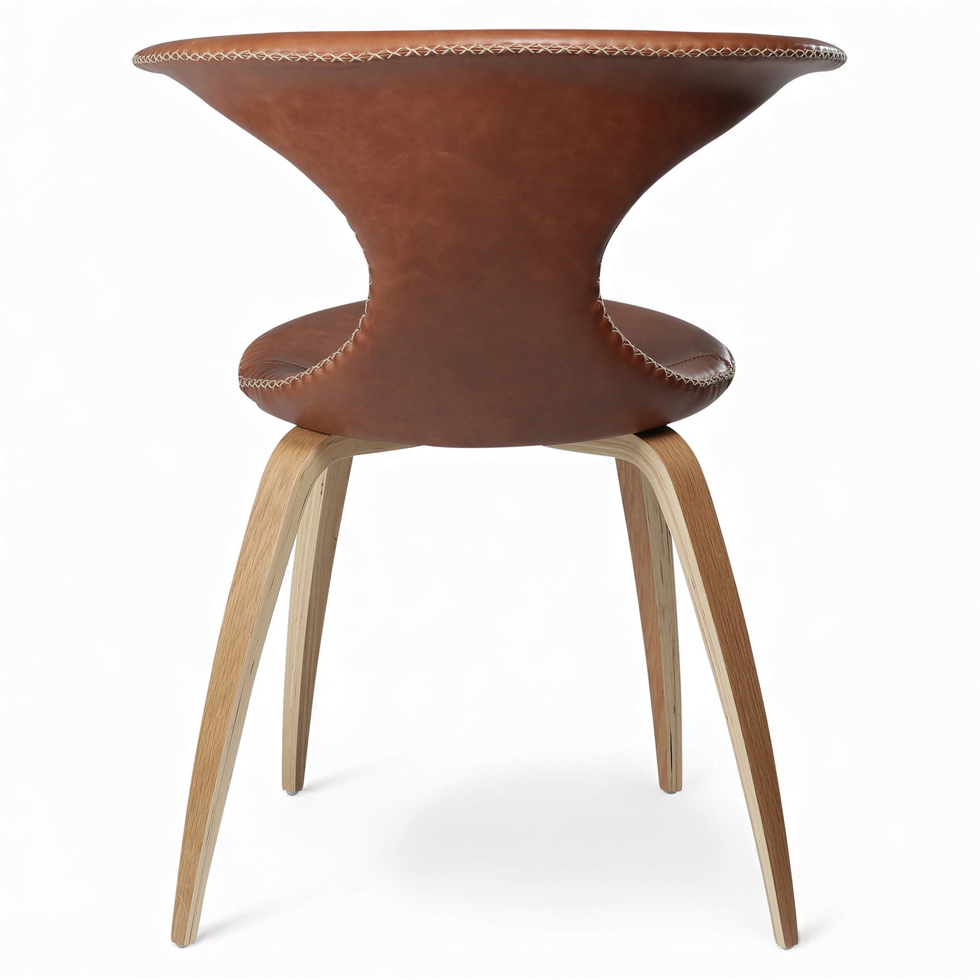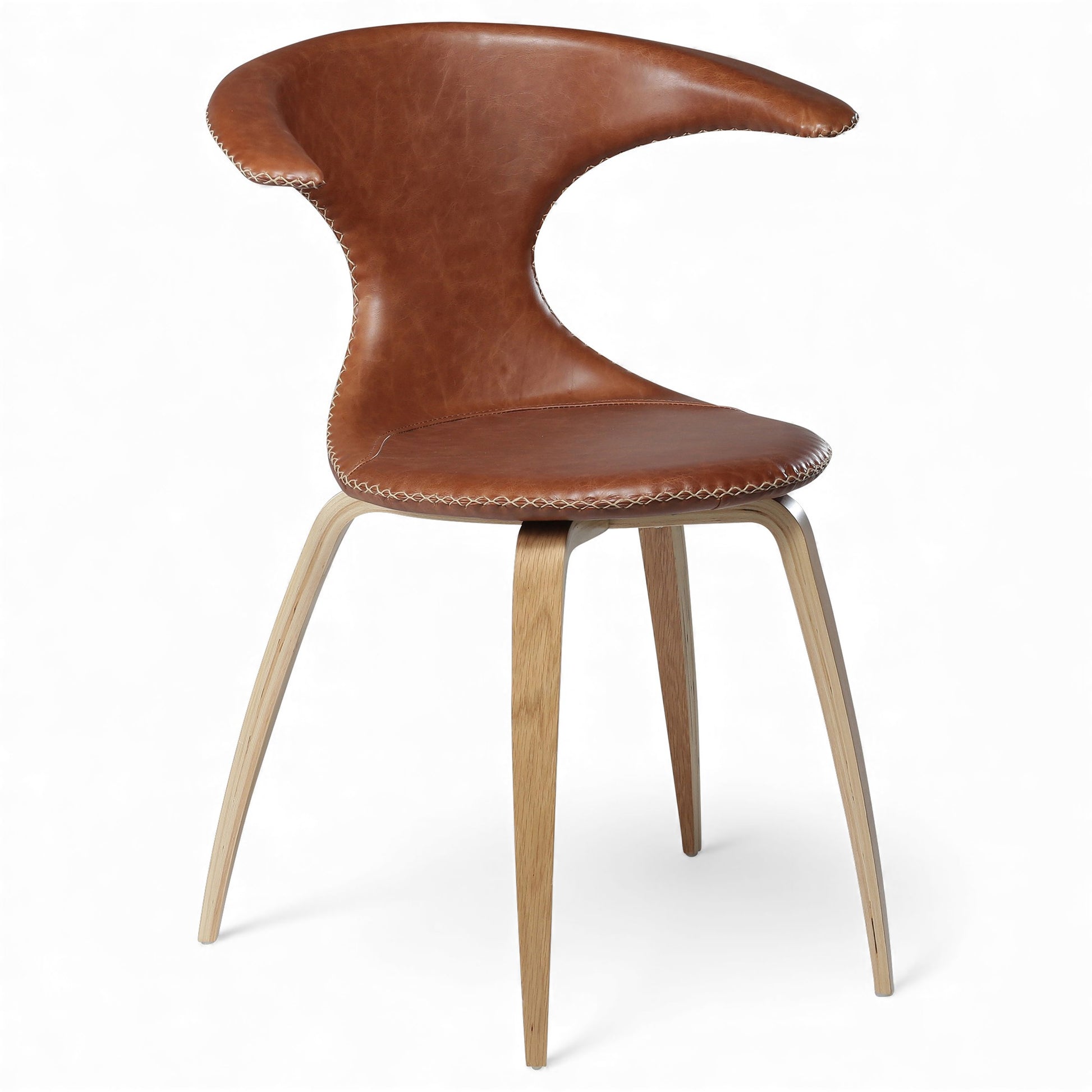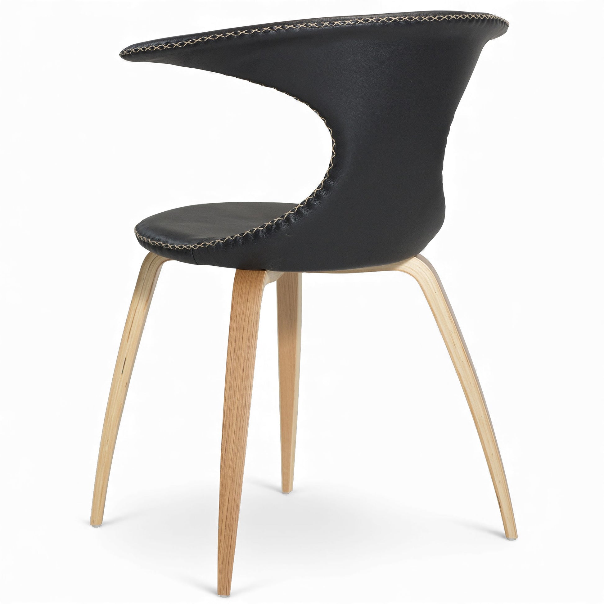 FLAIR-stolen forener komfort, form og funktion i én harmonisk helhed. Med sit bløde kunstlæder, elegante håndsyninger og naturlige træben er den et stilfuldt valg til moderne spiseområder og loungemiljøer.