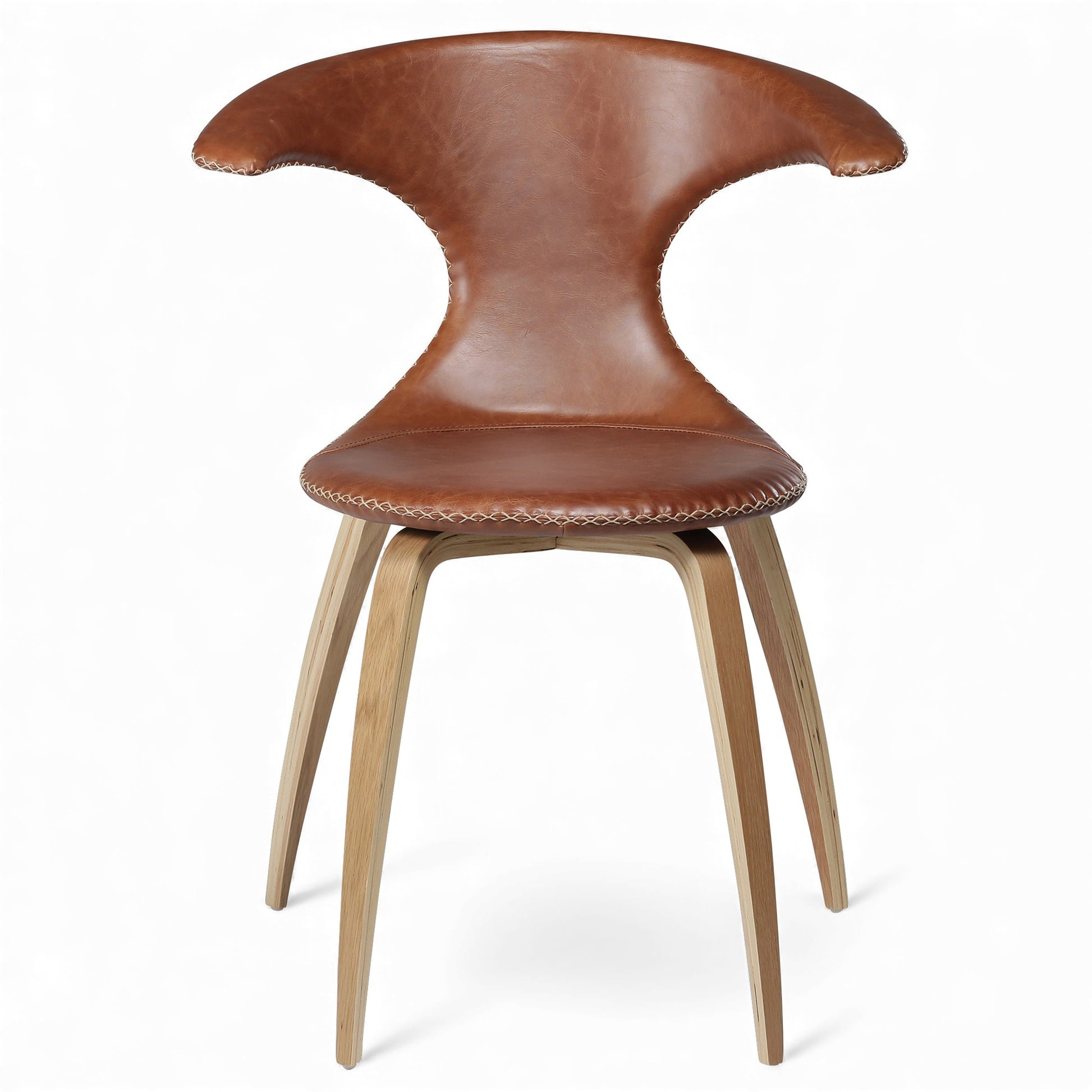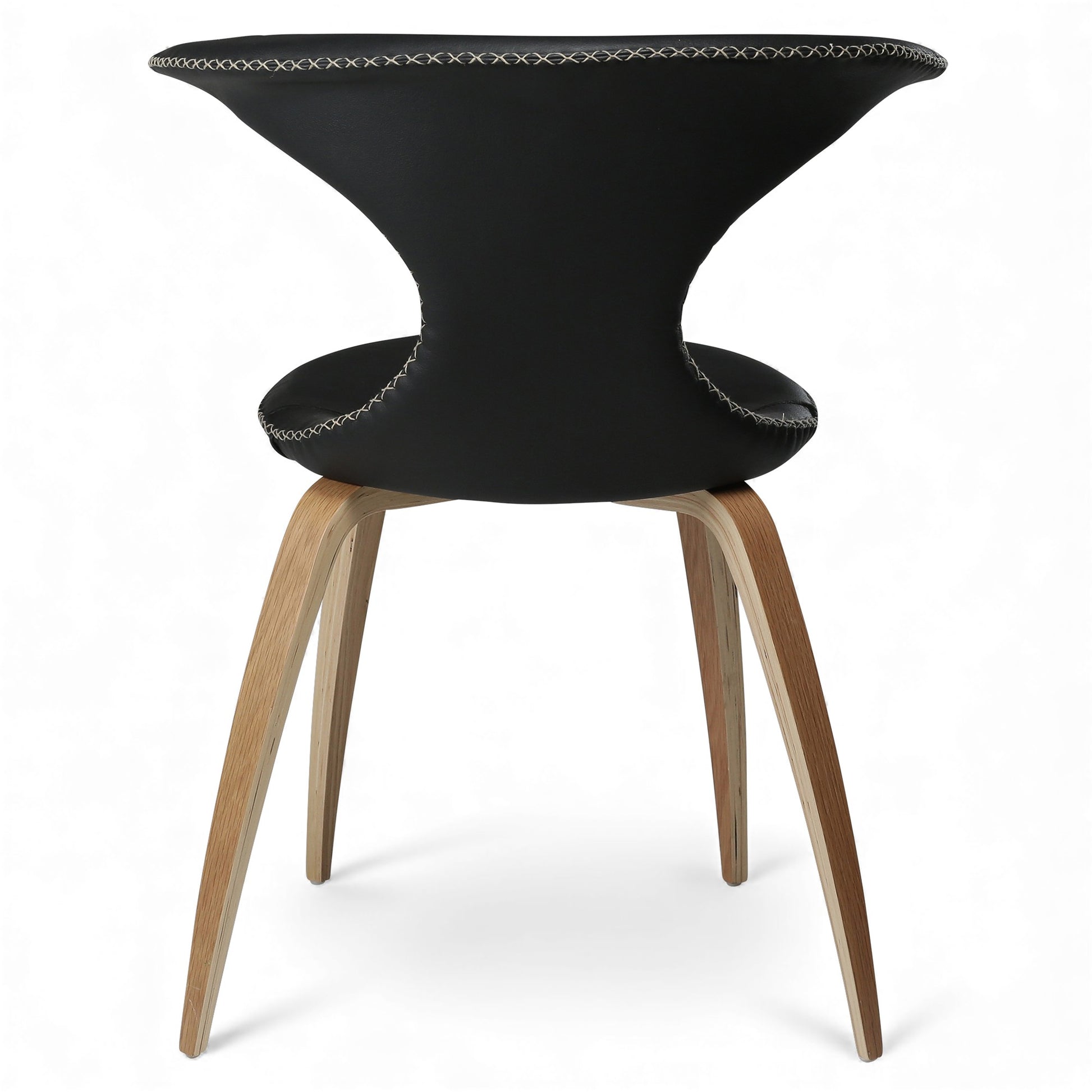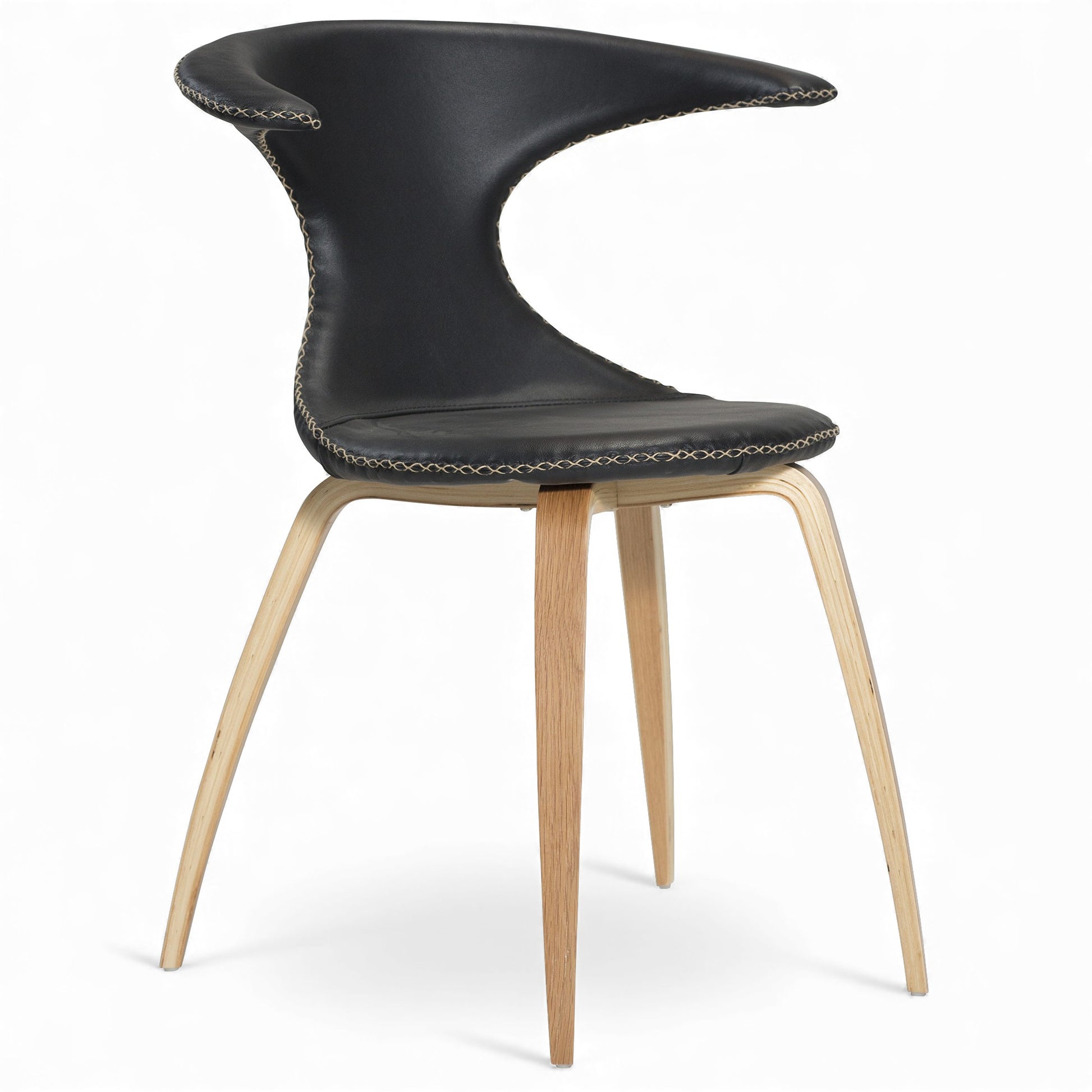 FLAIR-stolen forener komfort, form og funktion i én harmonisk helhed. Med sit bløde kunstlæder, elegante håndsyninger og naturlige træben er den et stilfuldt valg til moderne spiseområder og loungemiljøer.