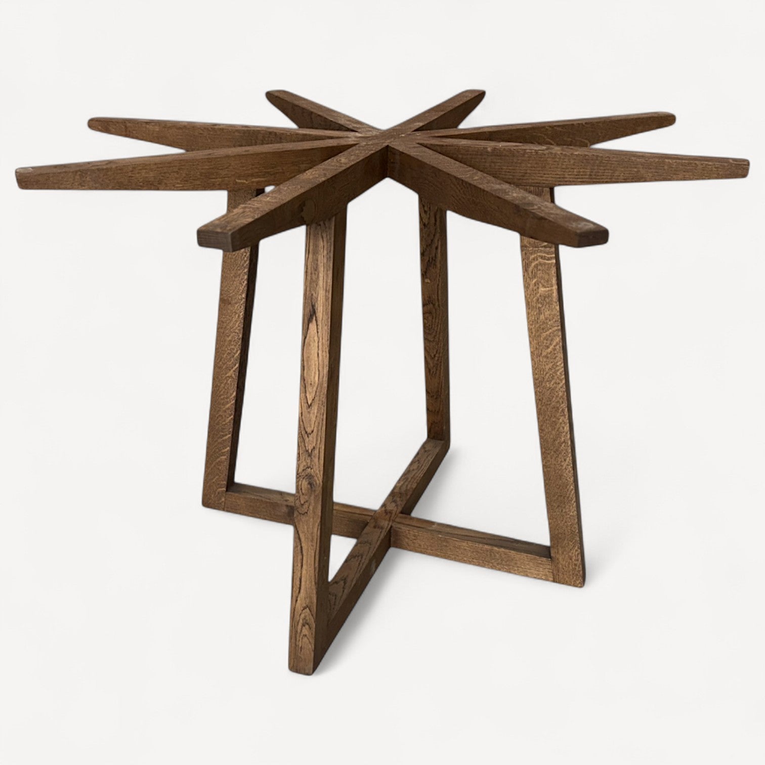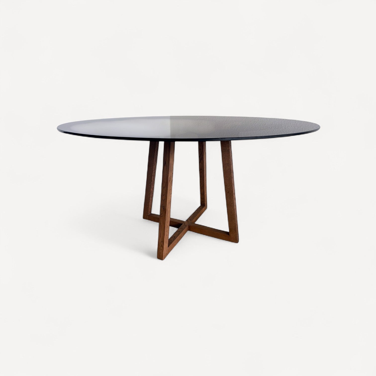 Dette glasbord forener massivt egetræ med moderne geometri. Stellet er opbygget af skråtstillede ben, forbundet af en rektangulær fodramme, der sikrer optimal stabilitet og giver bordet et arkitektonisk udtryk. Øverst bærer stellet et stjerneformet kryds, som danner en smuk kontrast til den lette glasplade og giver designet et karakterfuldt og skulpturelt præg.