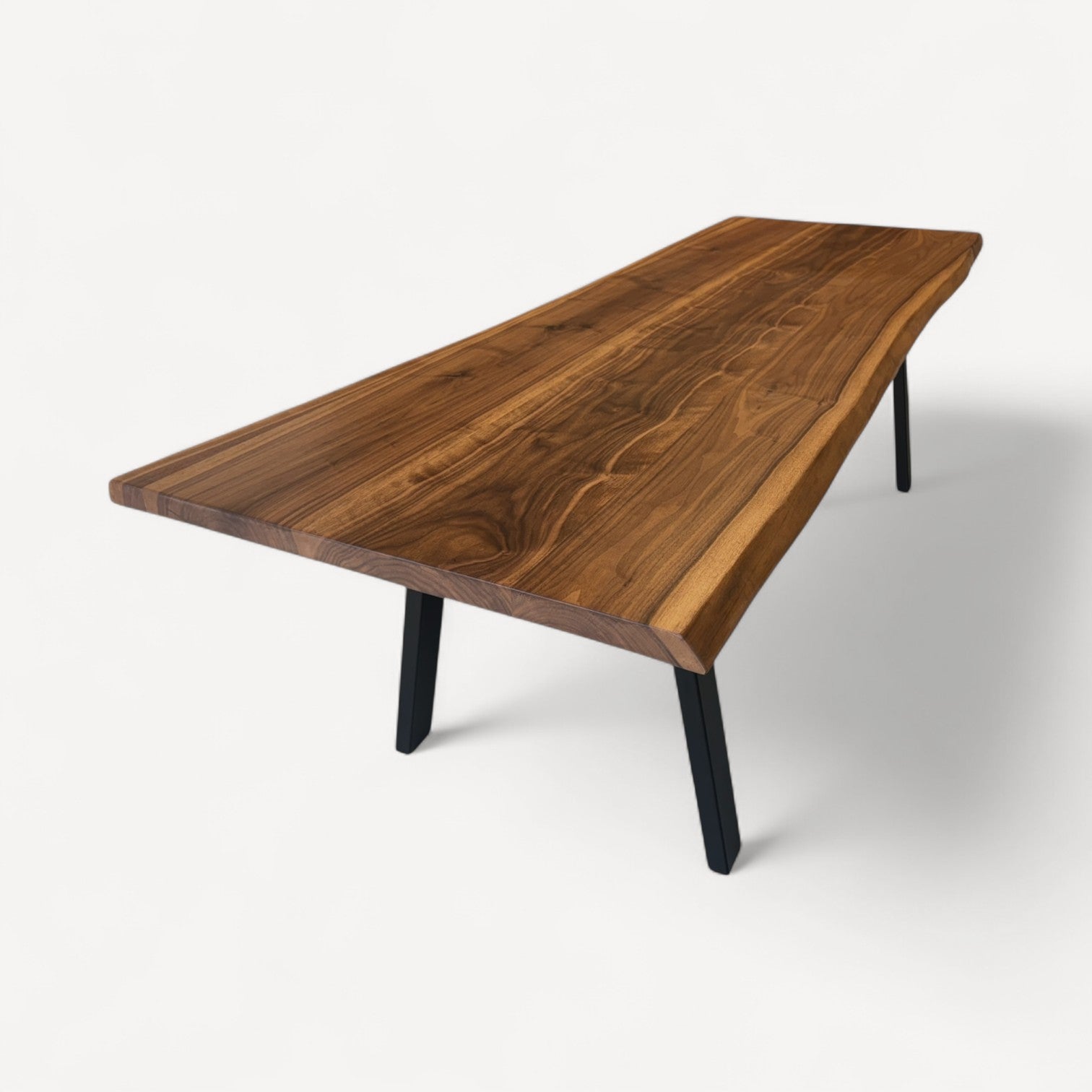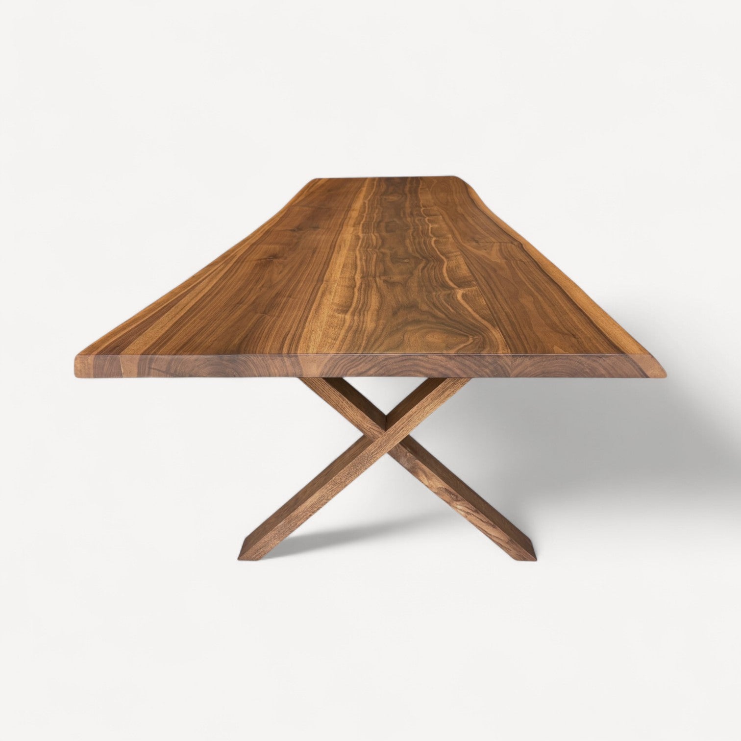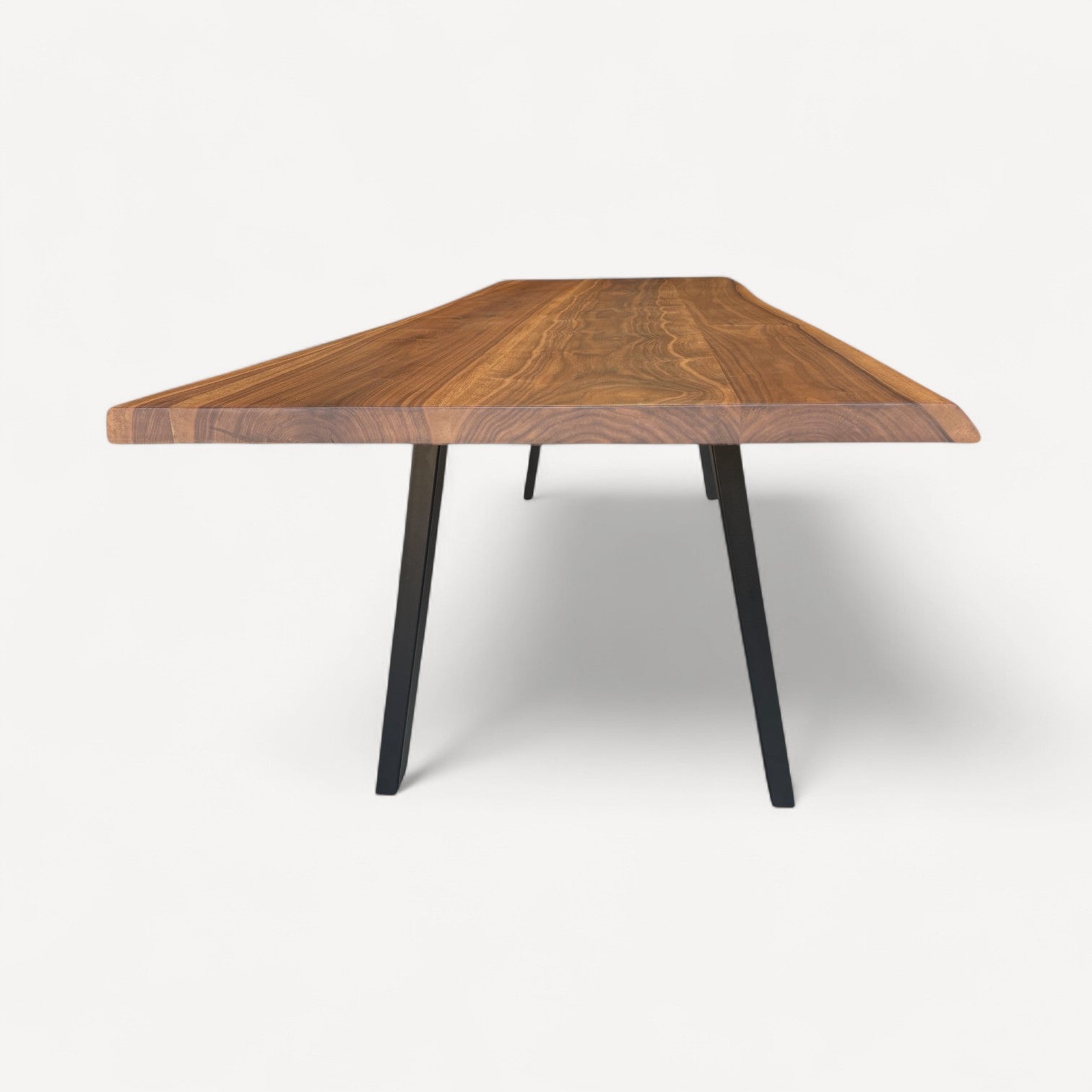 Dette firkantede plankebord er fremstilles af 5-6 massive valnødplanker i 4 cm tykkelse. Plankerne udskæres og samles efter snedkerfaglige principper, som forhindrer træets naturlige bevægelser og sikrer en stabil og formfast konstruktion. Valnøddens karakteristiske dybe åretegninger og farvespil giver bordet et eksklusivt og varmt udtryk.