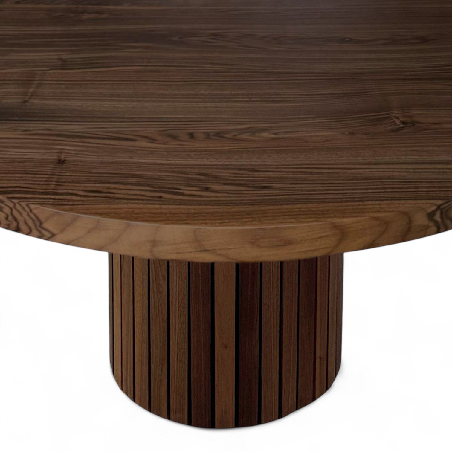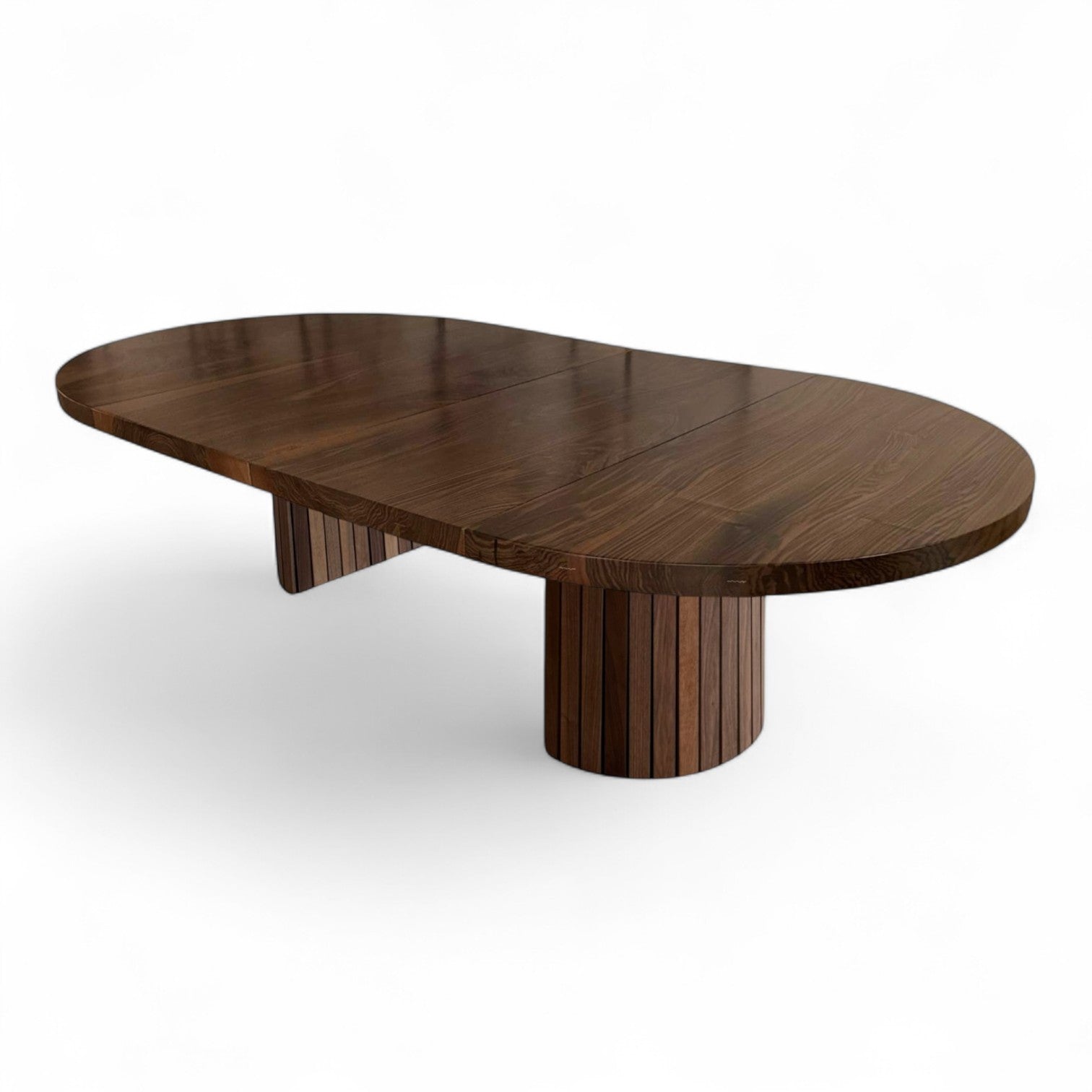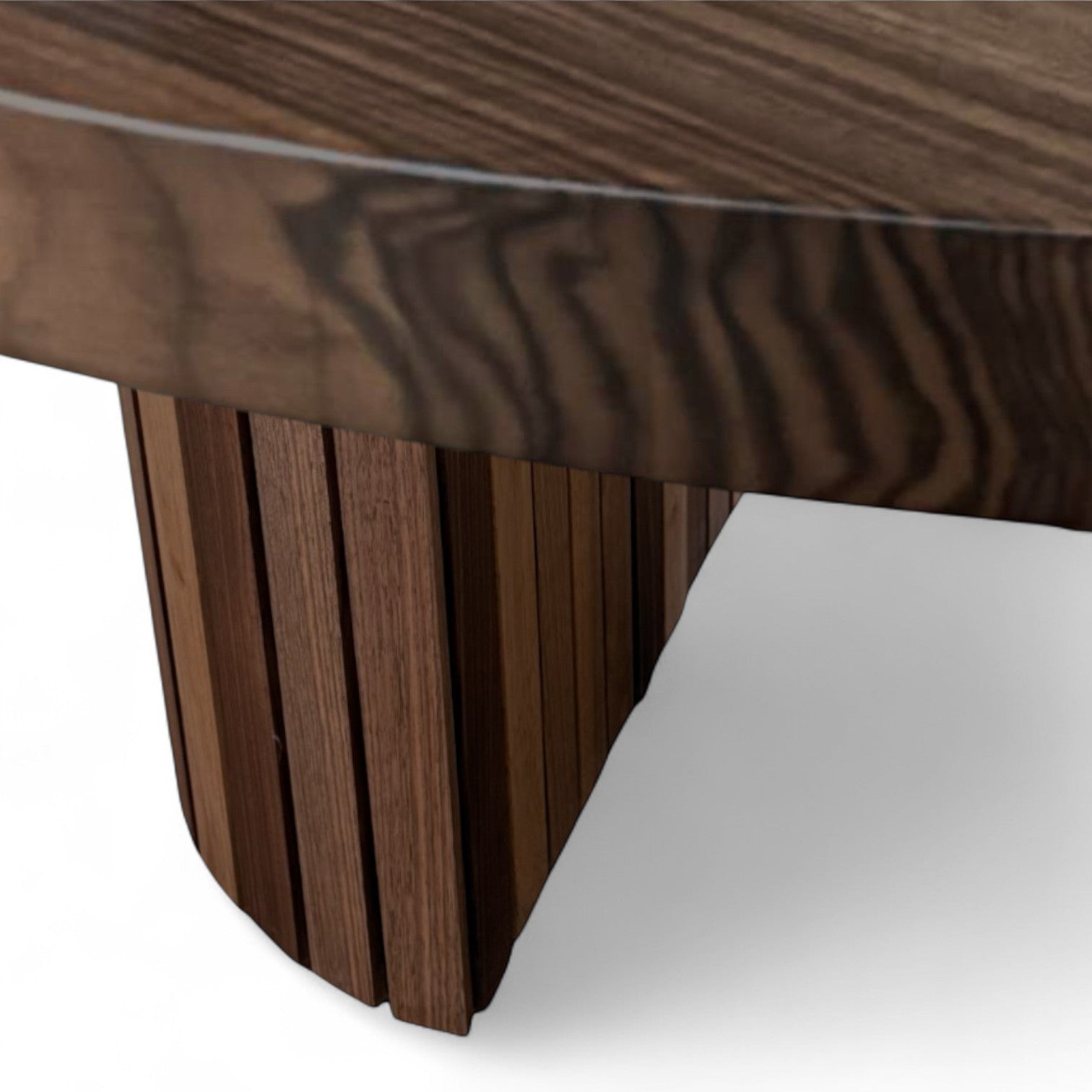 Understellet er udført i massivt valnød med smukke lodrette lameller, der skaber et harmonisk og elegant udtryk. Konstruktionen giver en solid stabilitet og understreger bordets naturlige eksklusivitet. Lamelstellets design tilfører varme og karakter til rummet og fremhæver træets levende struktur — en stilren løsning, der både er funktionel og æstetisk gennemført.