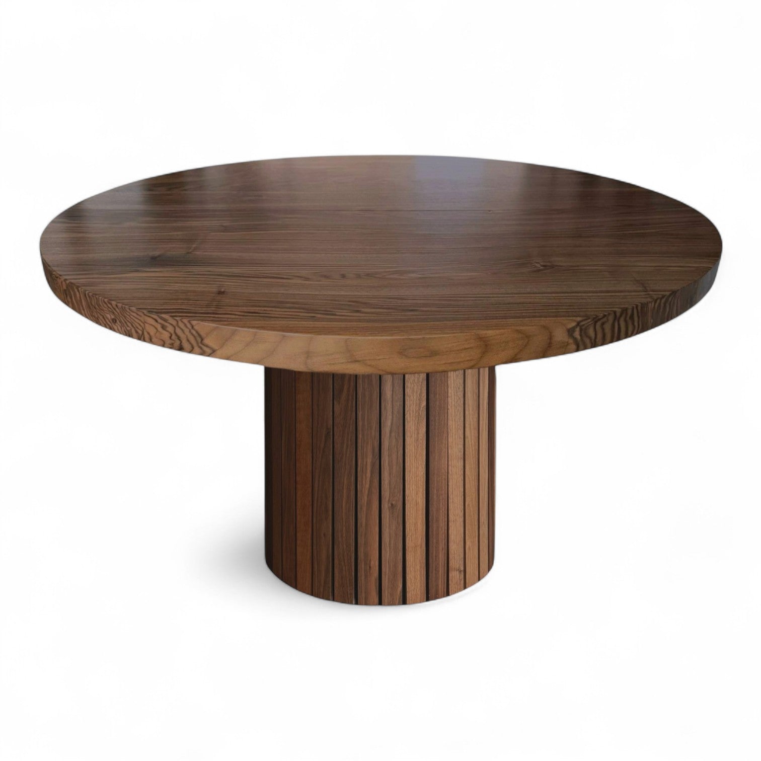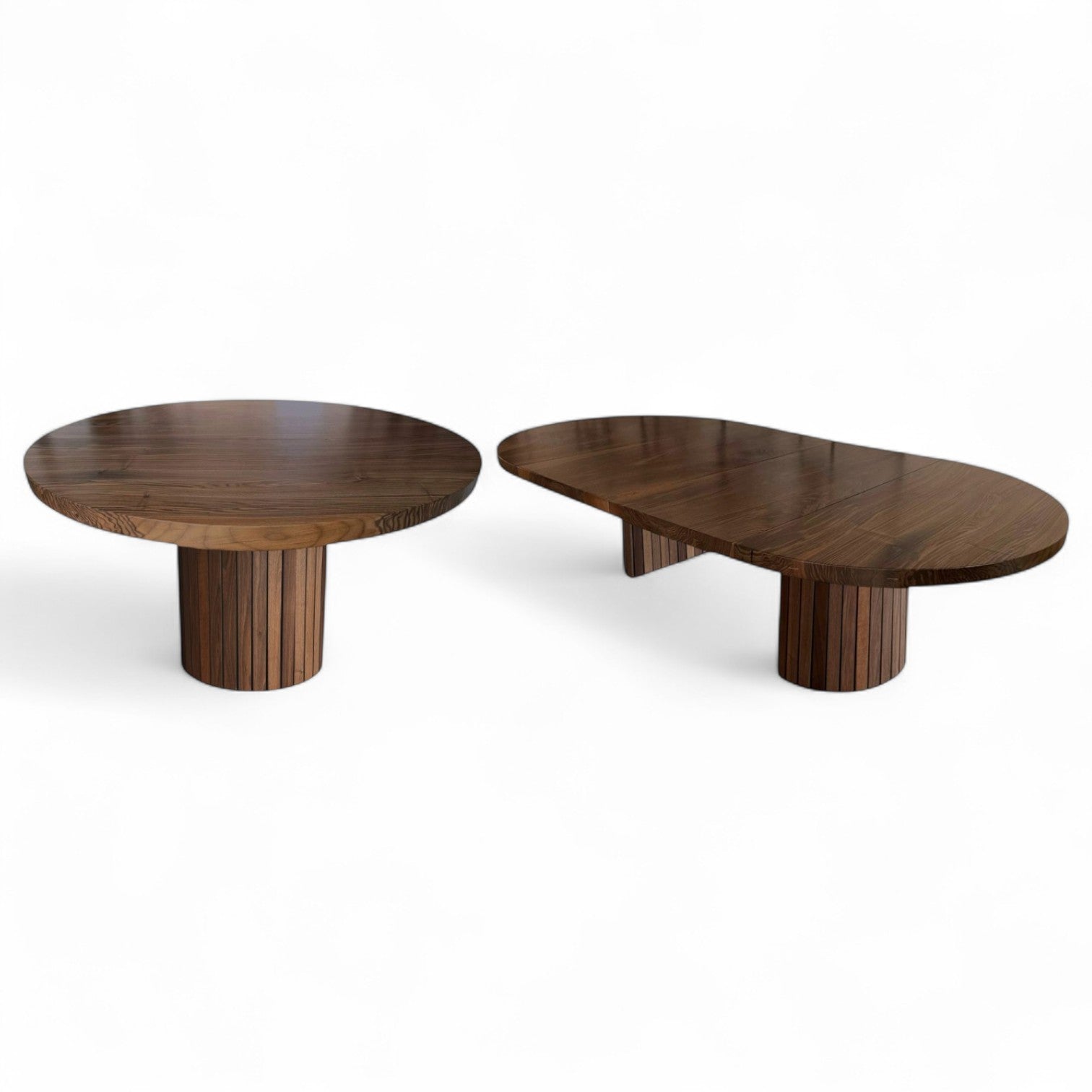 Rundt plankebord m. valnød sokkelfod + (0-2 tillægsplader)