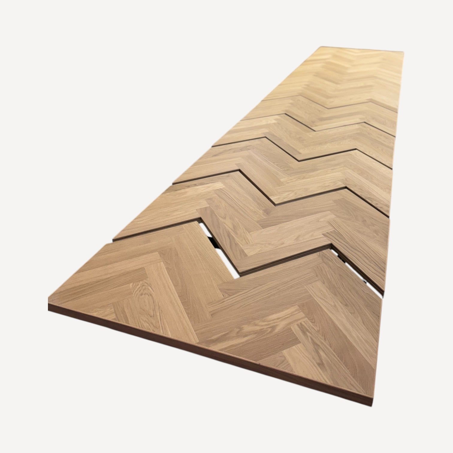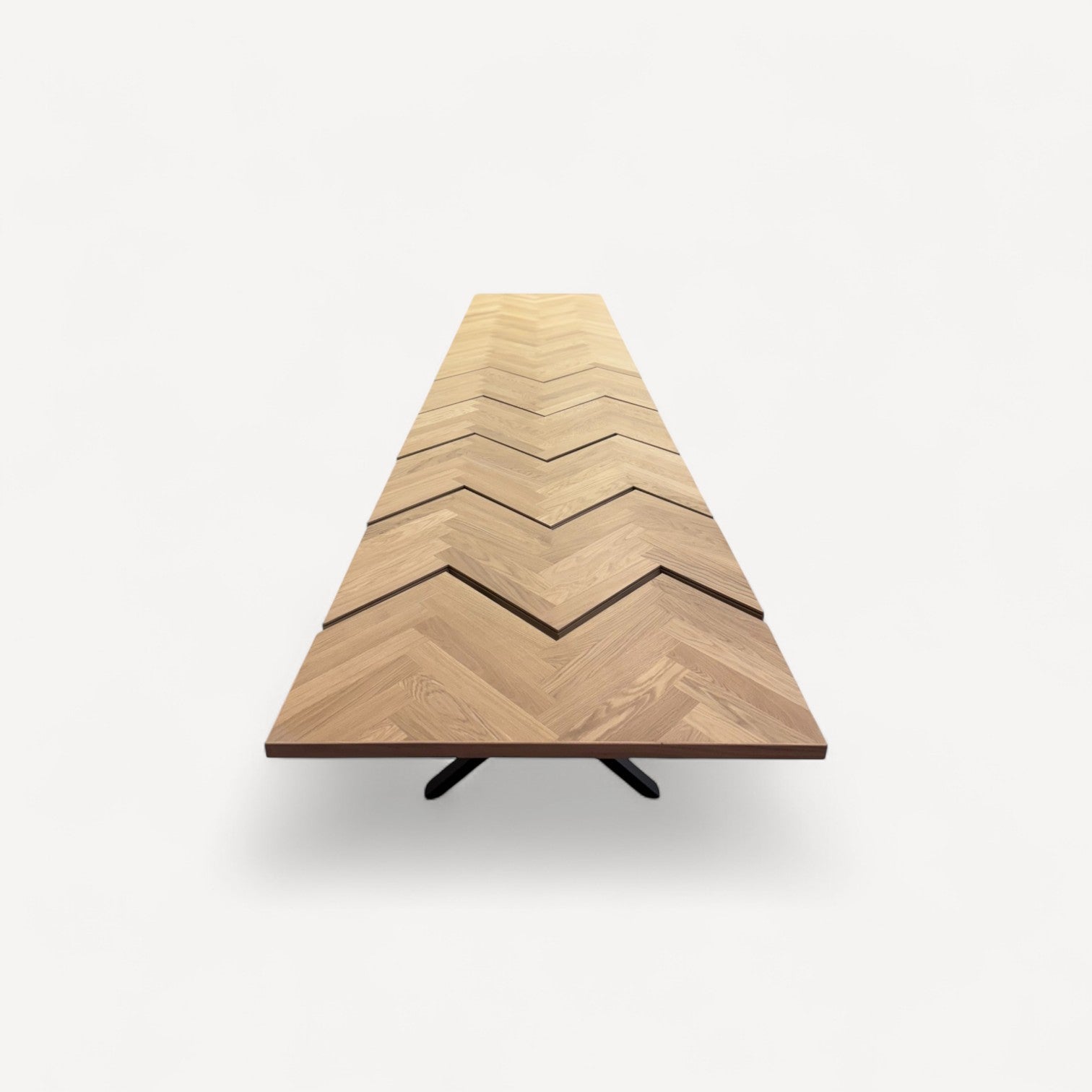 Dette smukke spisebord er skabt i massivt egetræ med en eksklusiv sildebensstruktur, som giver et tidløst og raffineret udtryk. Bordpladen består af 1.6 cm massiv egetræ lagt på en solid 2.2 cm MDF-underplade, afsluttet med en kraftig egetræsliste rundt om, der understreger det gennemførte håndværk.