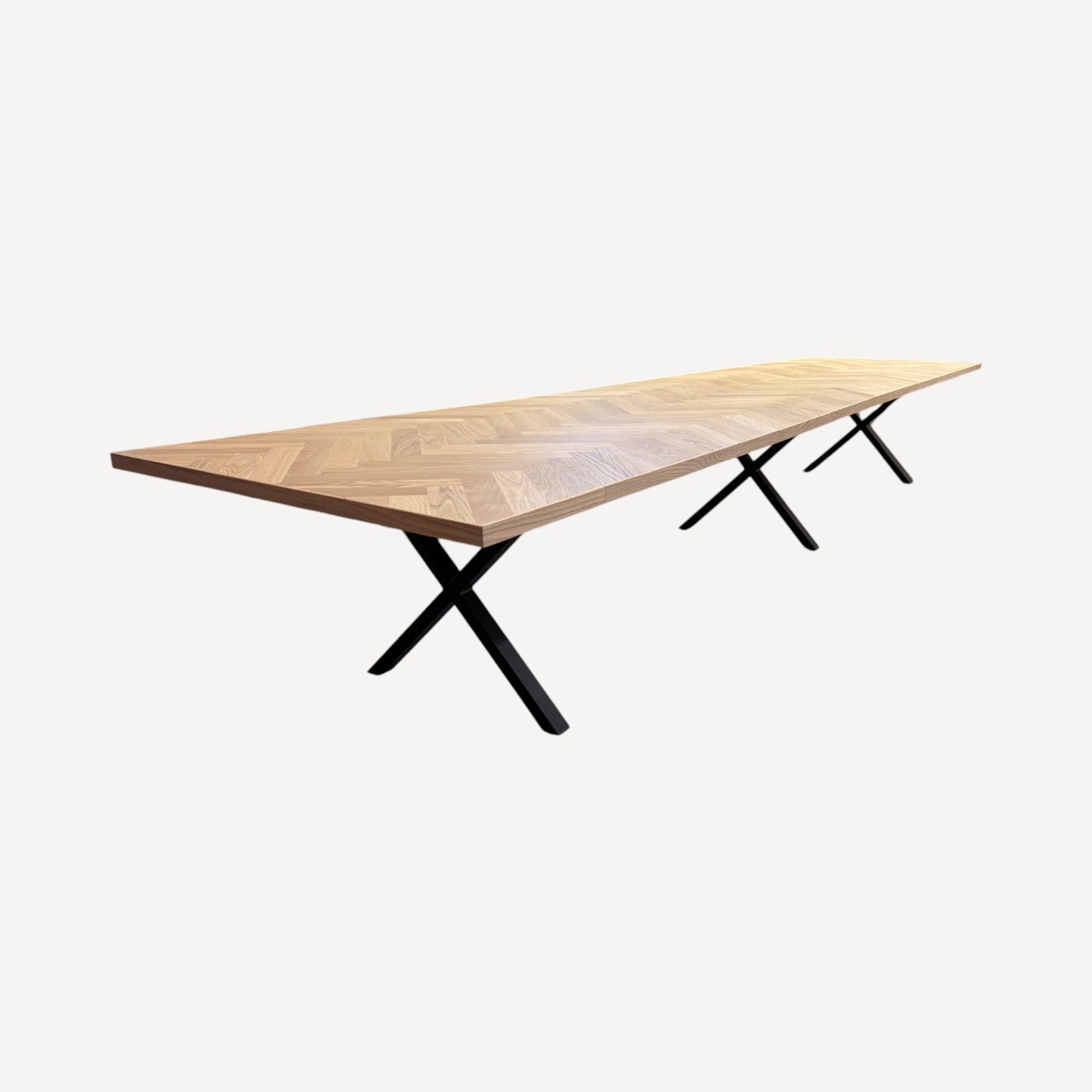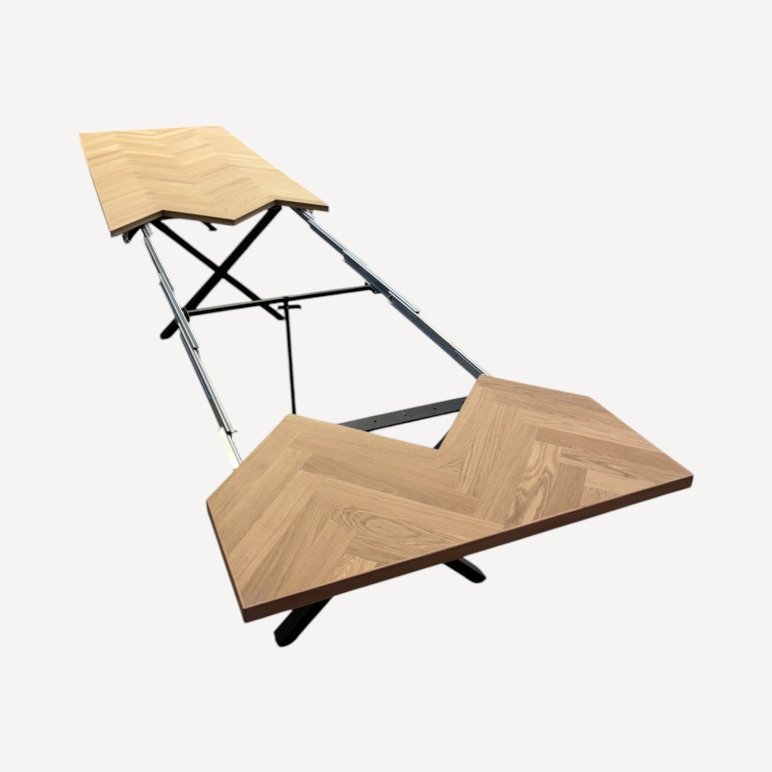 Understellet består af slanke X-bordben i pulverlakeret metal, som giver bordet et let og moderne udtryk. Designet kombinerer stabilitet med et minimalistisk look, der lader sildebensmønstret få den visuelle opmærksomhed, mens bordbenene understøtter helheden diskret og stilfuldt.