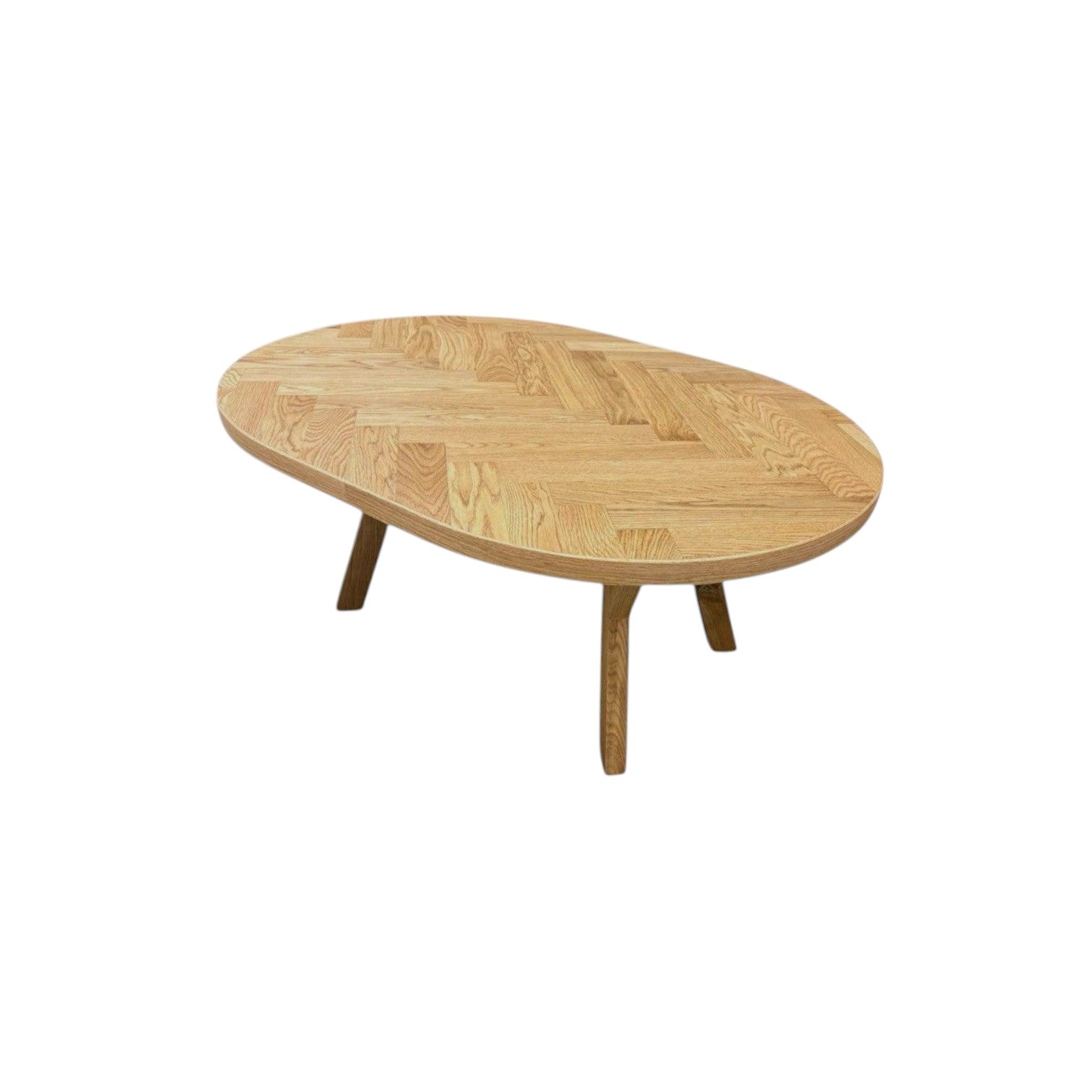 Dette elegante sofabord er udført i massiv eg og kombinerer sildebensmønstrets klassiske karakter med moderne blødhed. Bordpladen er nøje sammensat af udvalgte stykker træ, der fremhæver egetræets naturlige spil. De afrundede kanter og den ovale form giver bordet et harmonisk udtryk, der passer smukt ind i både minimalistiske og varme hjem.