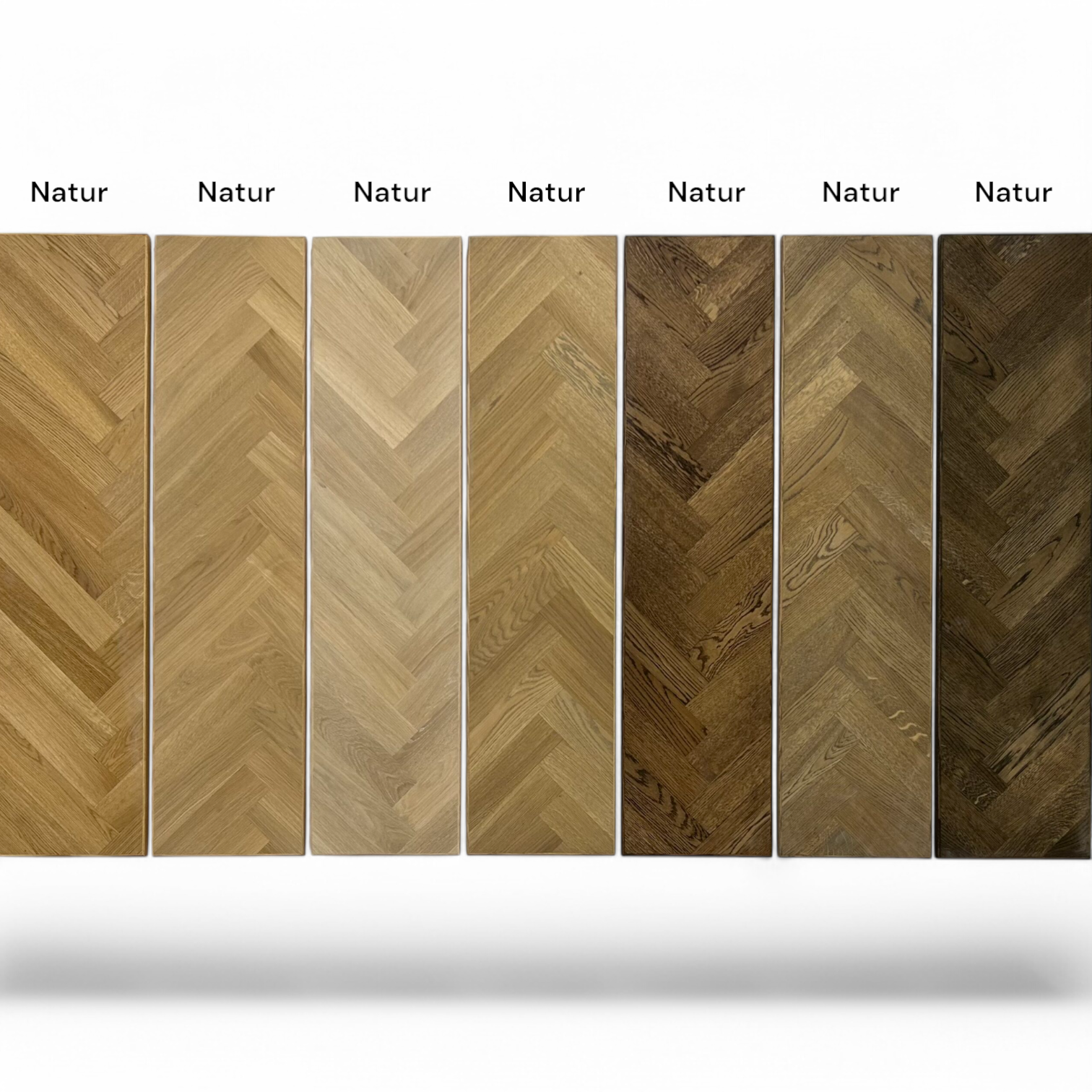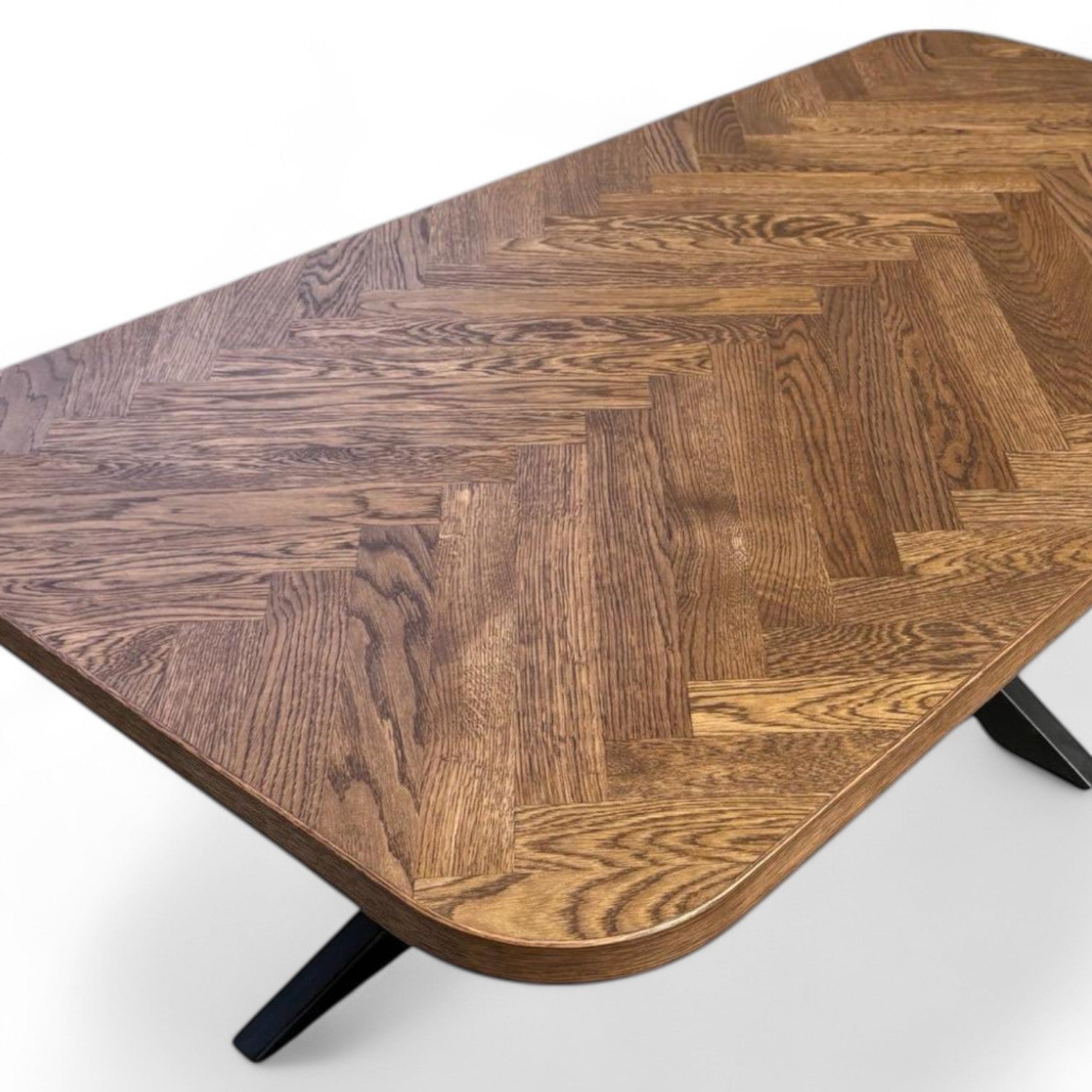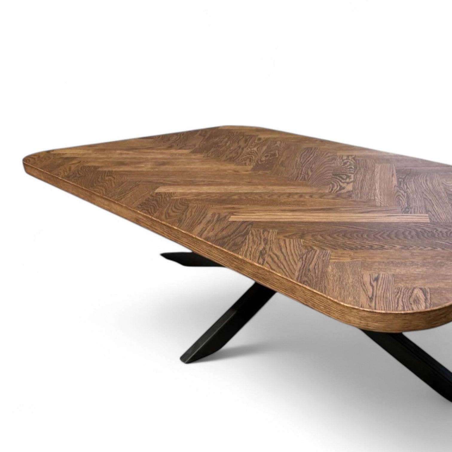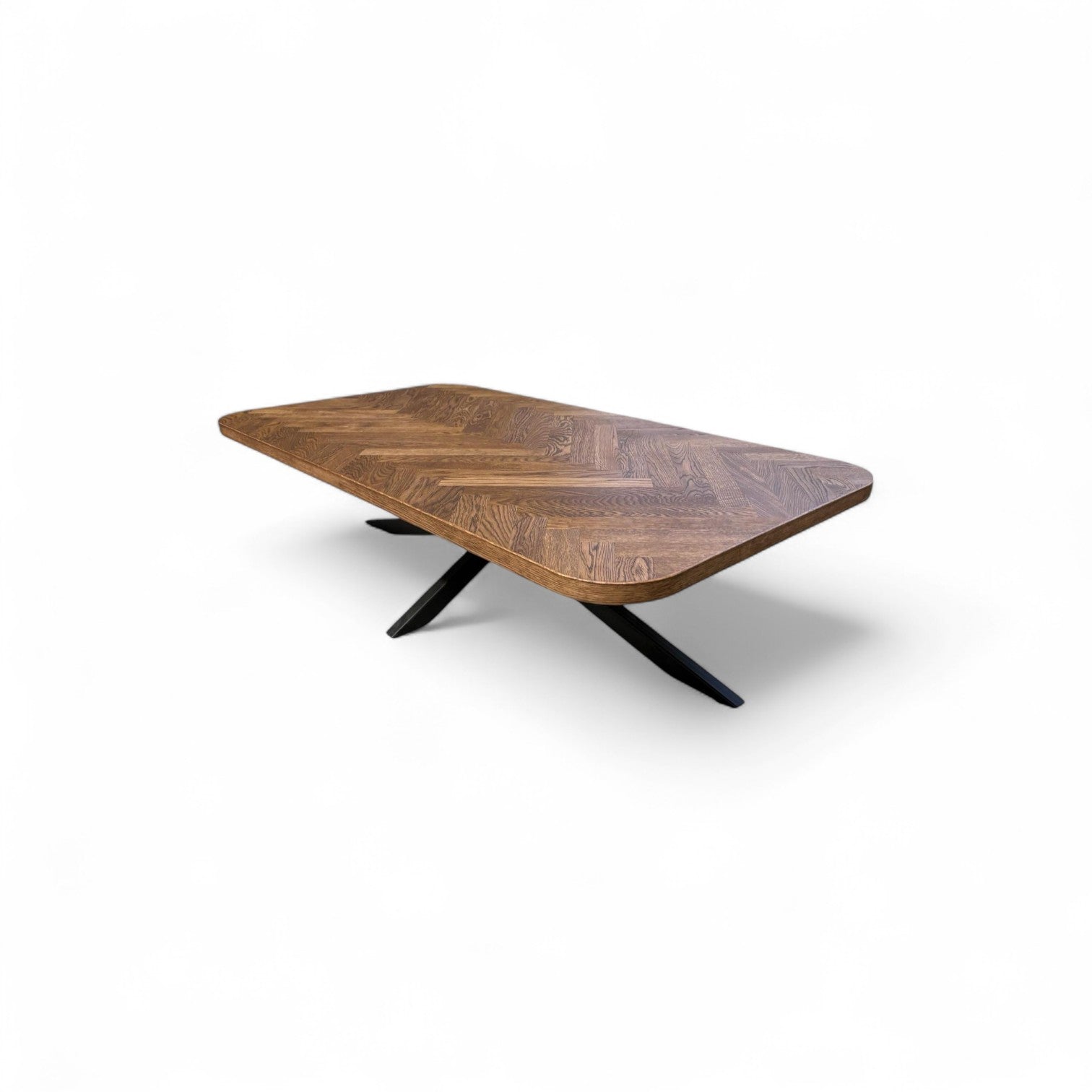 Dette sofabord kombinerer det klassiske sildebensmønster med moderne blødhed og afrundede former. Bordpladen er udført i massivt træ og sammensat i hånden, hvor hver enkelt stav er nøje udvalgt for at skabe spil, balance og karakter i mønstret. De afrundede kanter hele vejen rundt giver bordet et organisk og roligt udtryk, som bløder rummet op – uden at gå på kompromis med kant og stil.
