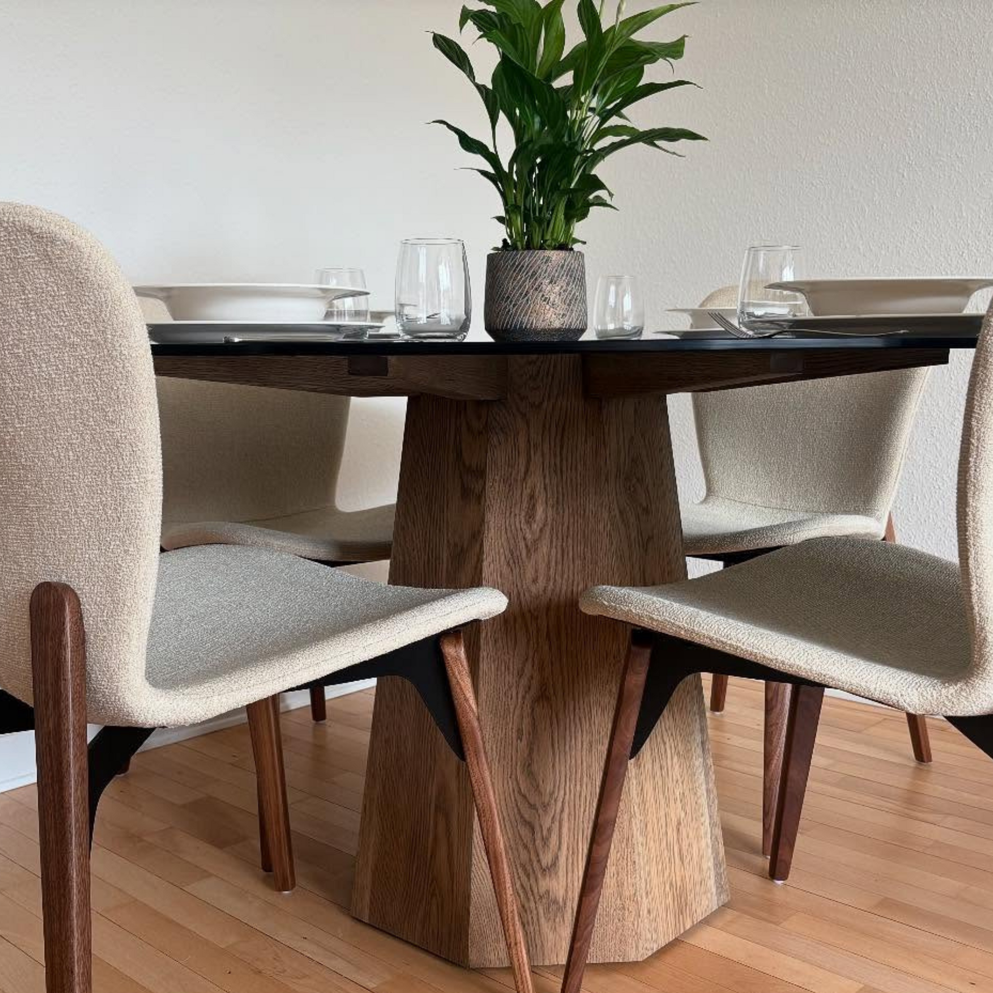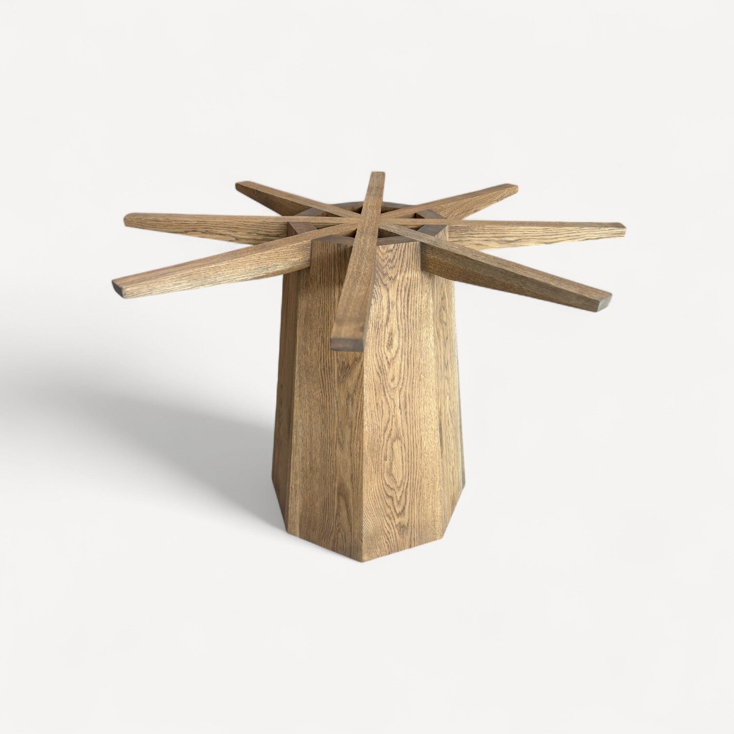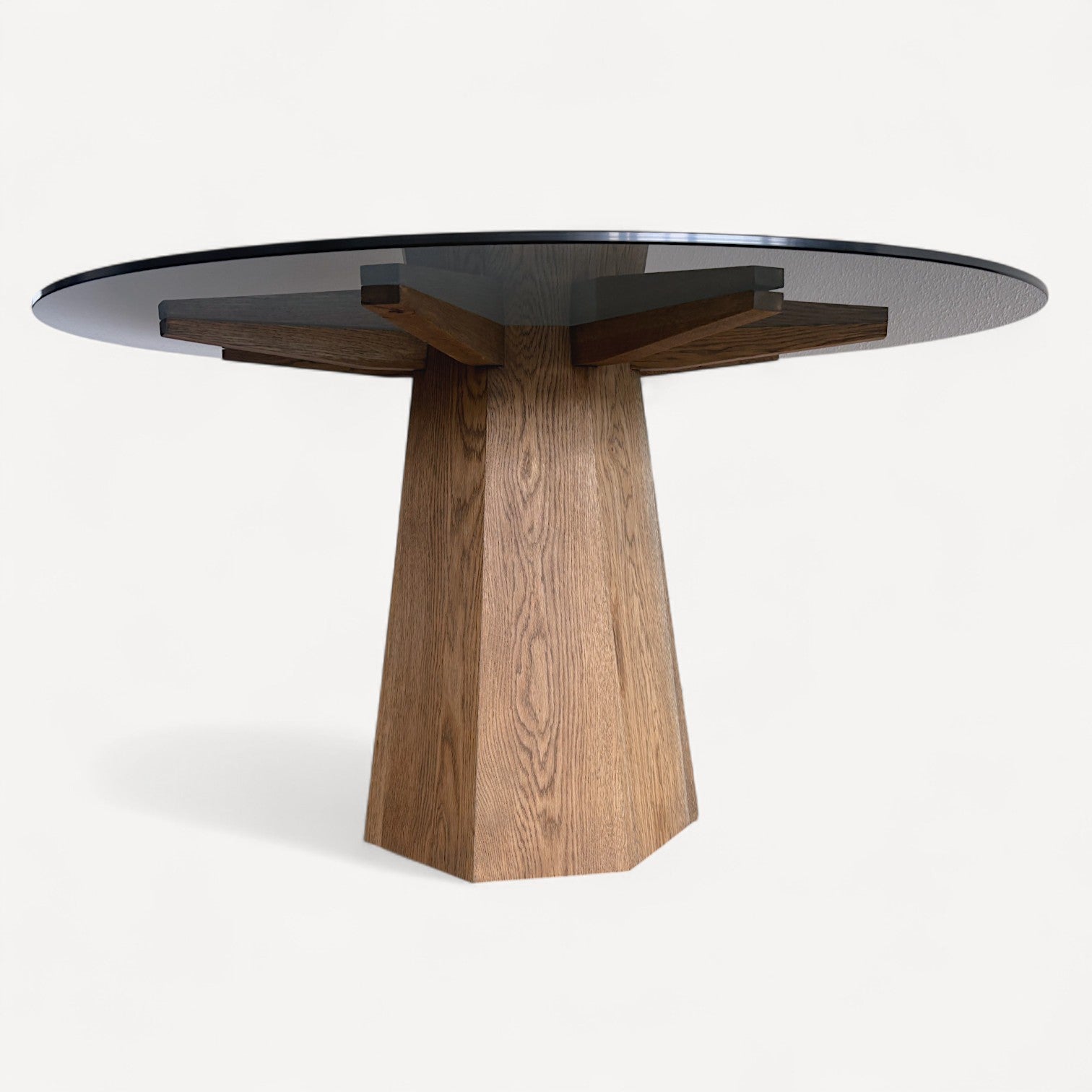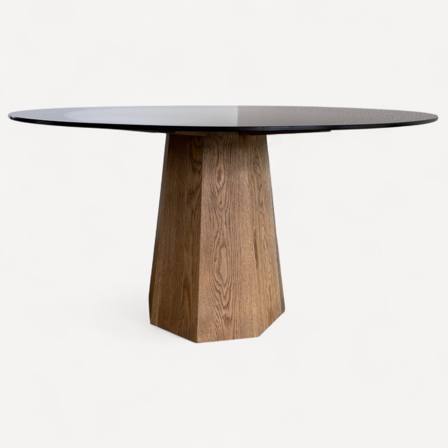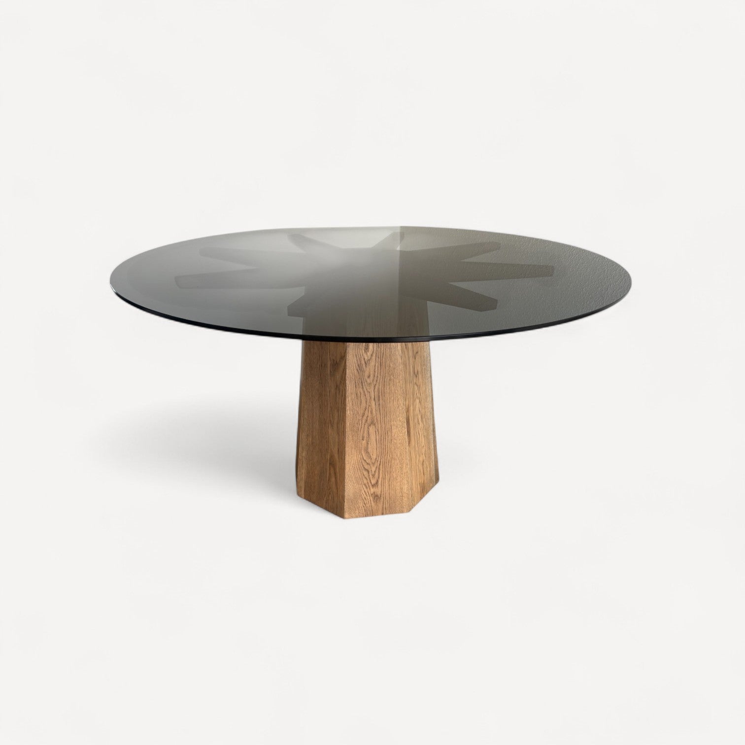 Dette glasbord kombinerer tidløst snedkerhåndværk med et arkitektonisk, monolitisk udtryk. Stellet består af en massiv søjlefod i egetræ, der står som en stabil base for den elegante glasplade. Bordets stjerneformede topkonstruktion binder designet sammen og skaber en smuk kontrast mellem det solide træ og den lette glasoverflade. Resultatet er et bord, der udstråler både styrke og finesse.