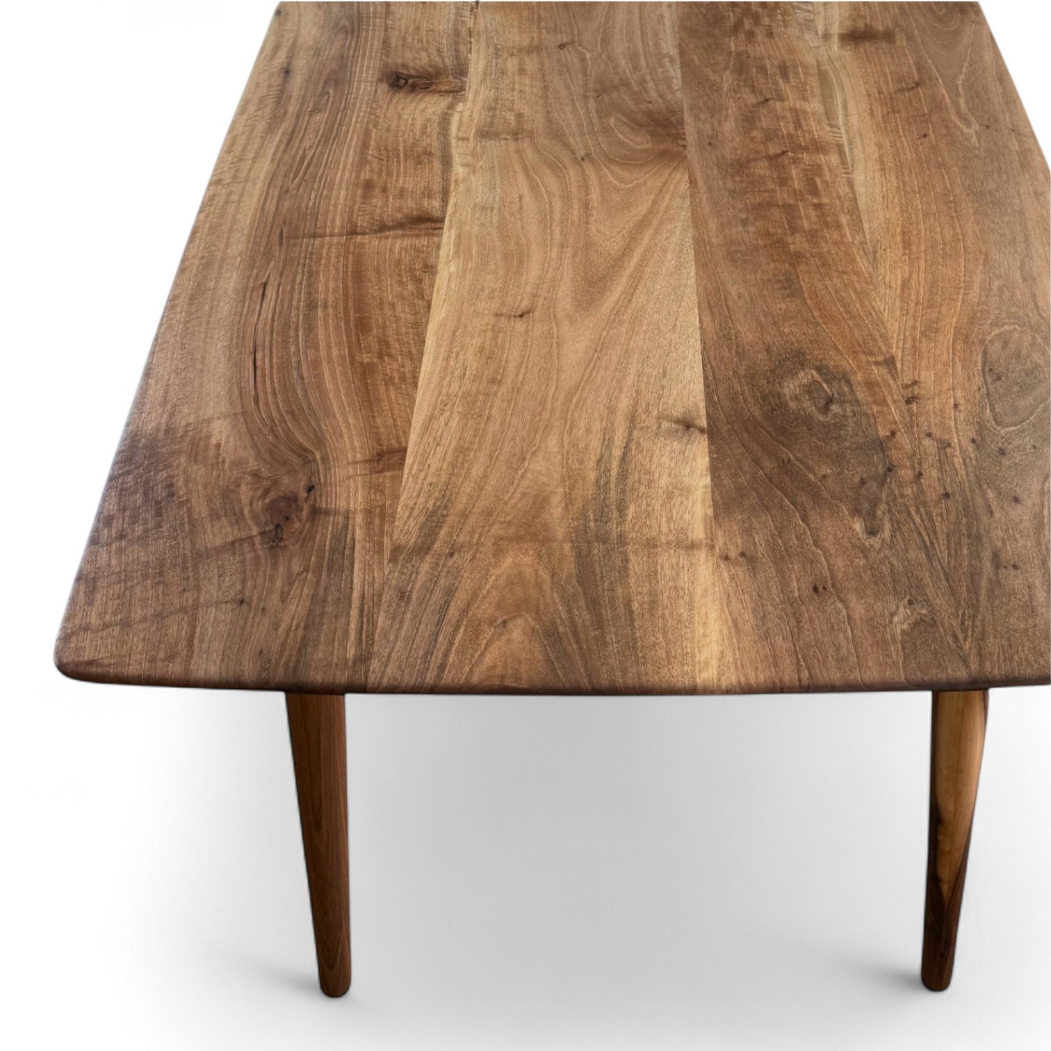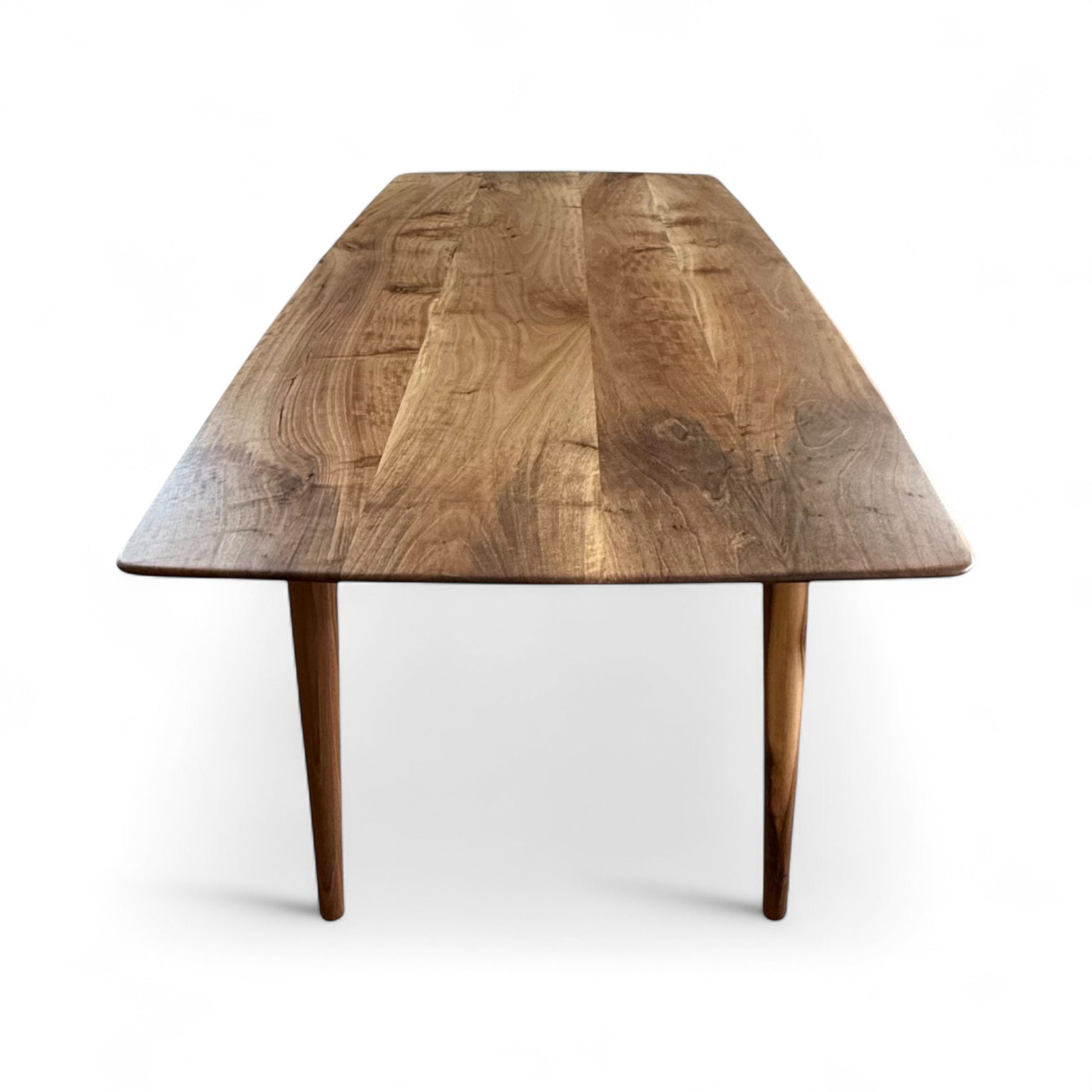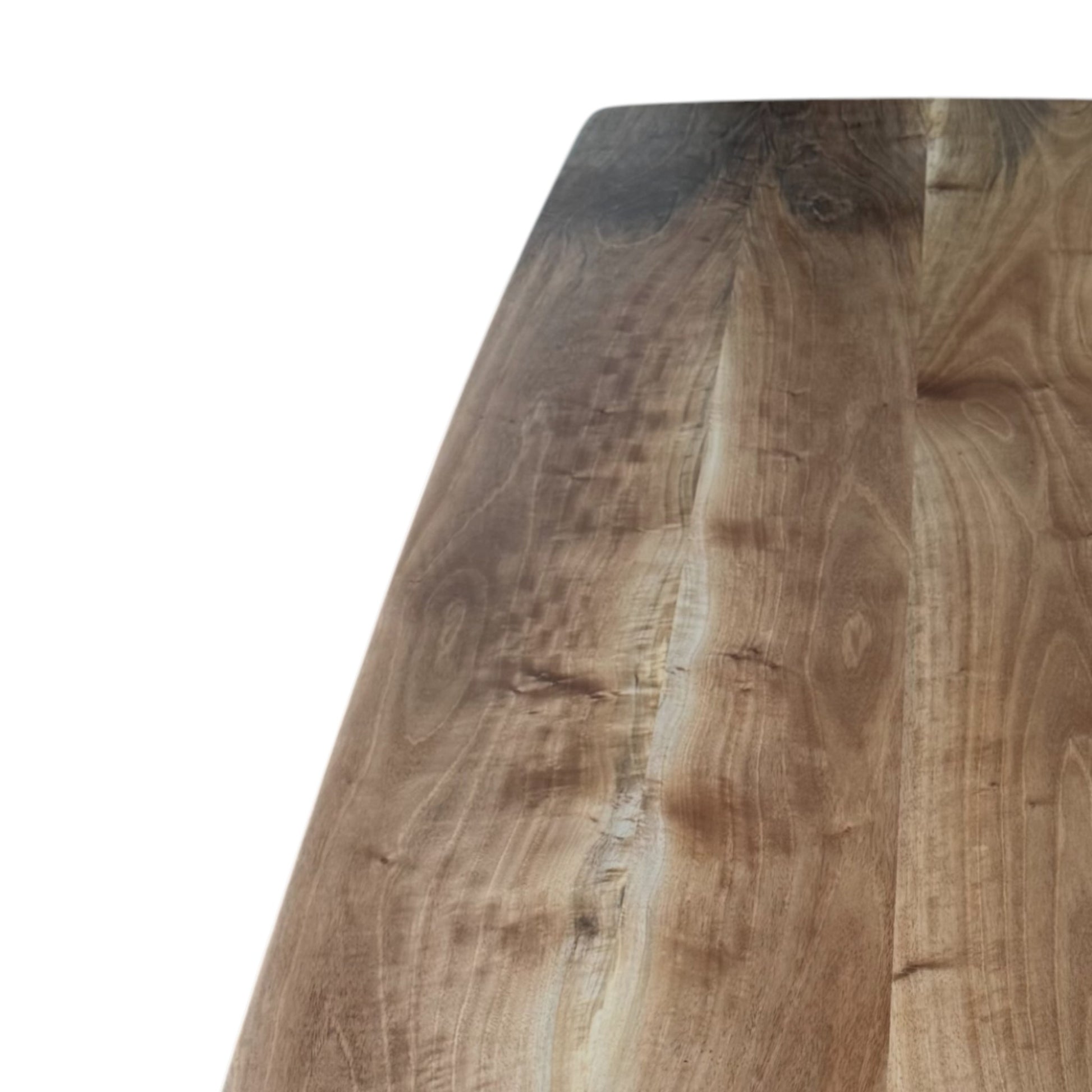 Eksklusivt spisebord udført i massiv europæisk valnød med en bordplade på 4 cm i tykkelsen. Bordet fremstilles i 4 hele planker, som nøje udvælges og sammensættes for at skabe et harmonisk og levende udtryk med naturlige åretegninger og varme nuancer. De bløde kanter giver bordet en organisk og elegant form, der fremhæver træets struktur.