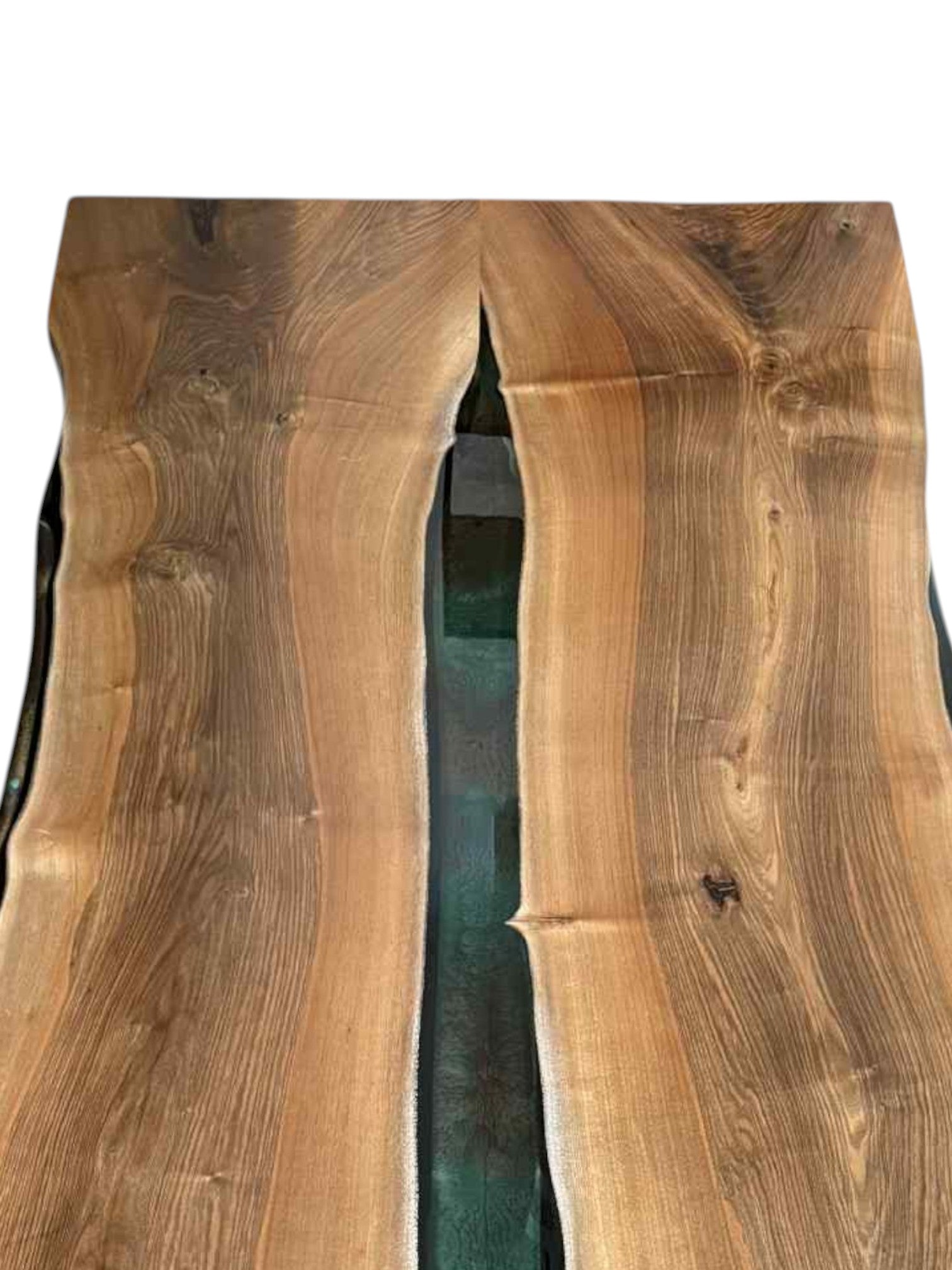 Midte åbningen er udfyldt med mørkegrøn/brun epoxy, der giver et naturinspireret “flod”-udtryk. Ovenpå er hældt et lag klar UV-stabil epoxy, som gør det muligt at se dybden og strukturen i epoxyen samt træets naturlige karakter.
